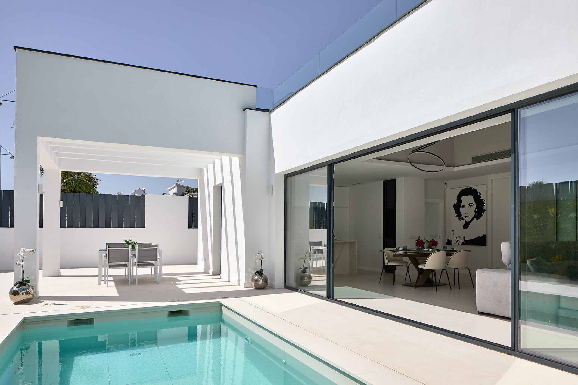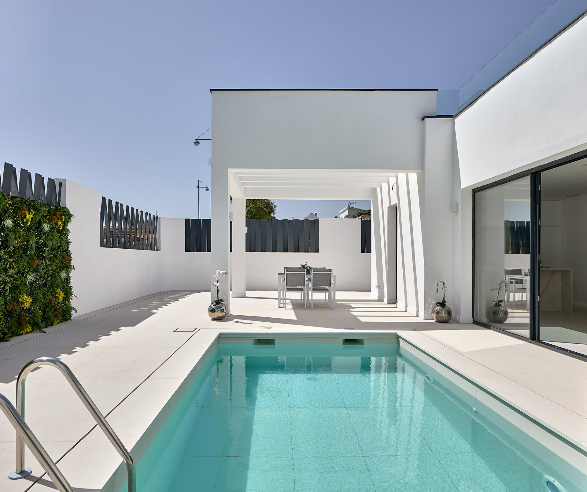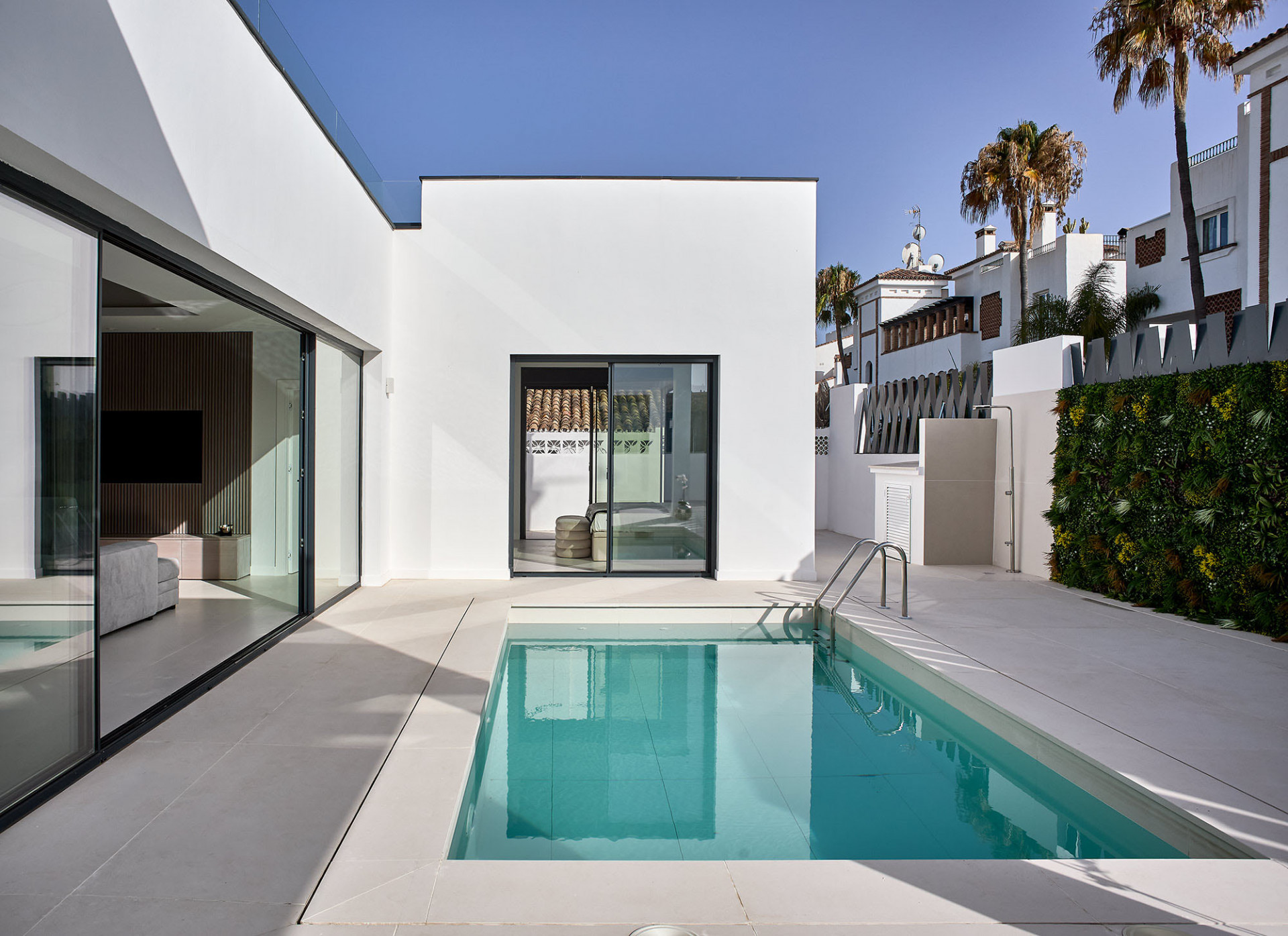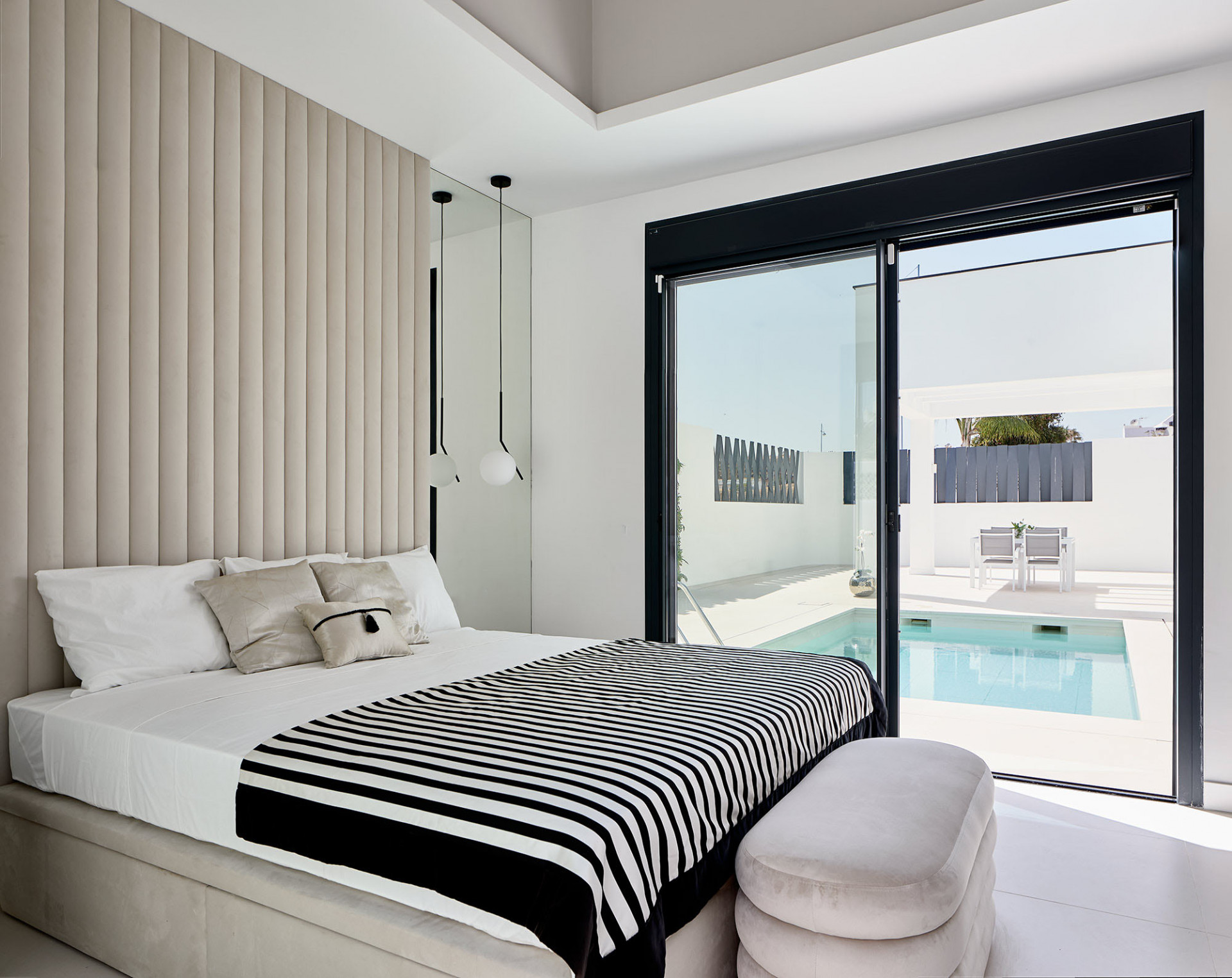 En el interior, la villa ofrece un espacio de una sola planta, donde los tres dormitorios se abren a la terraza privada y a la refrescante piscina de 8×4 m.