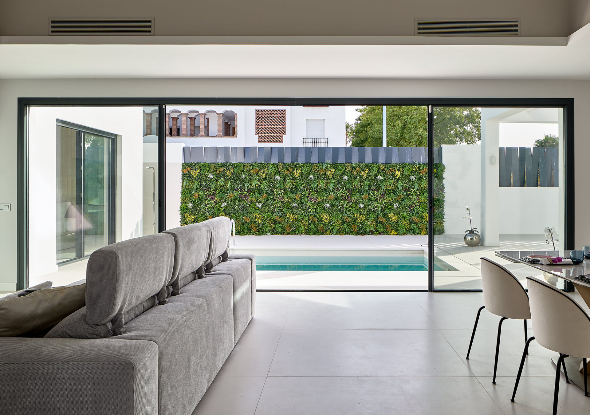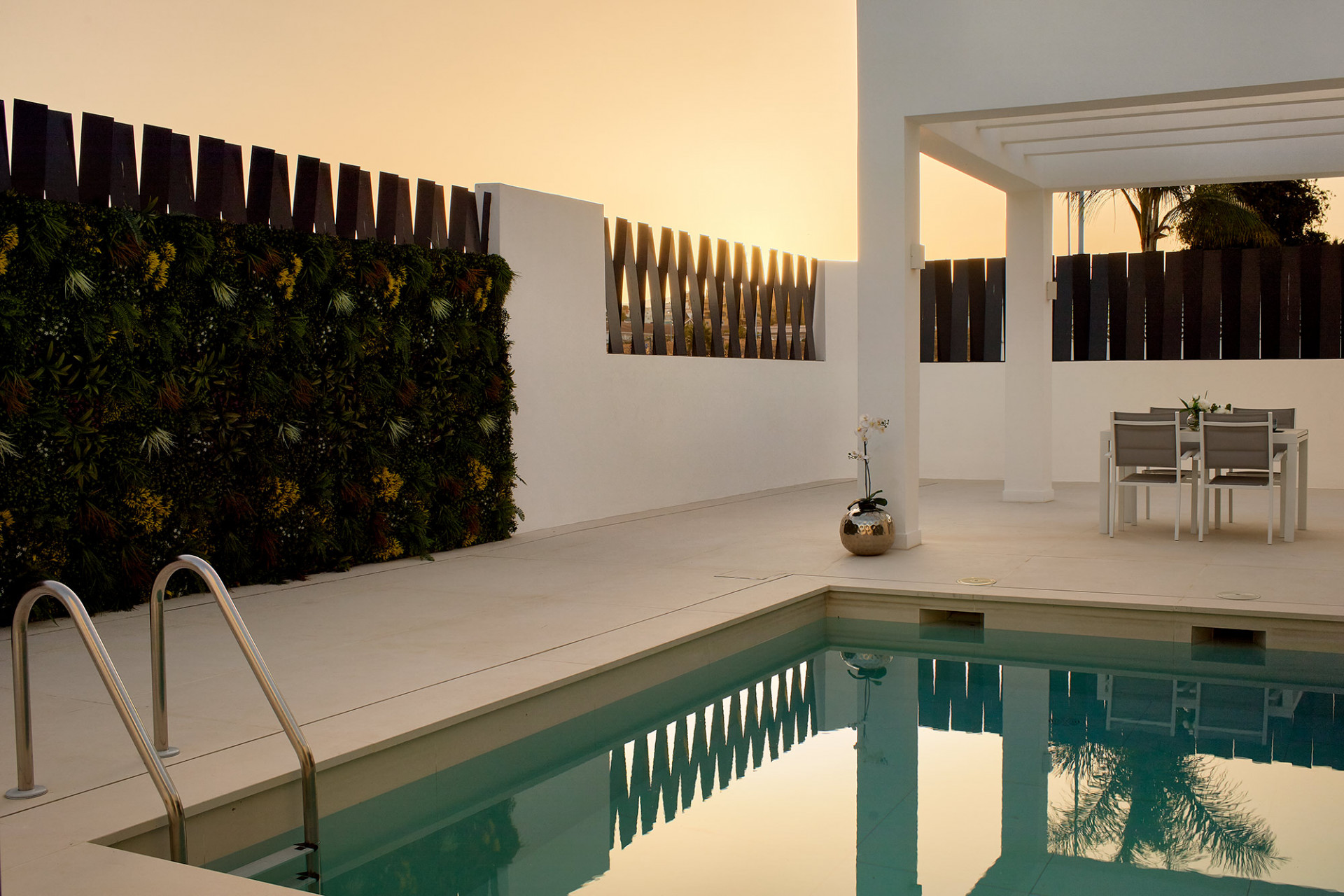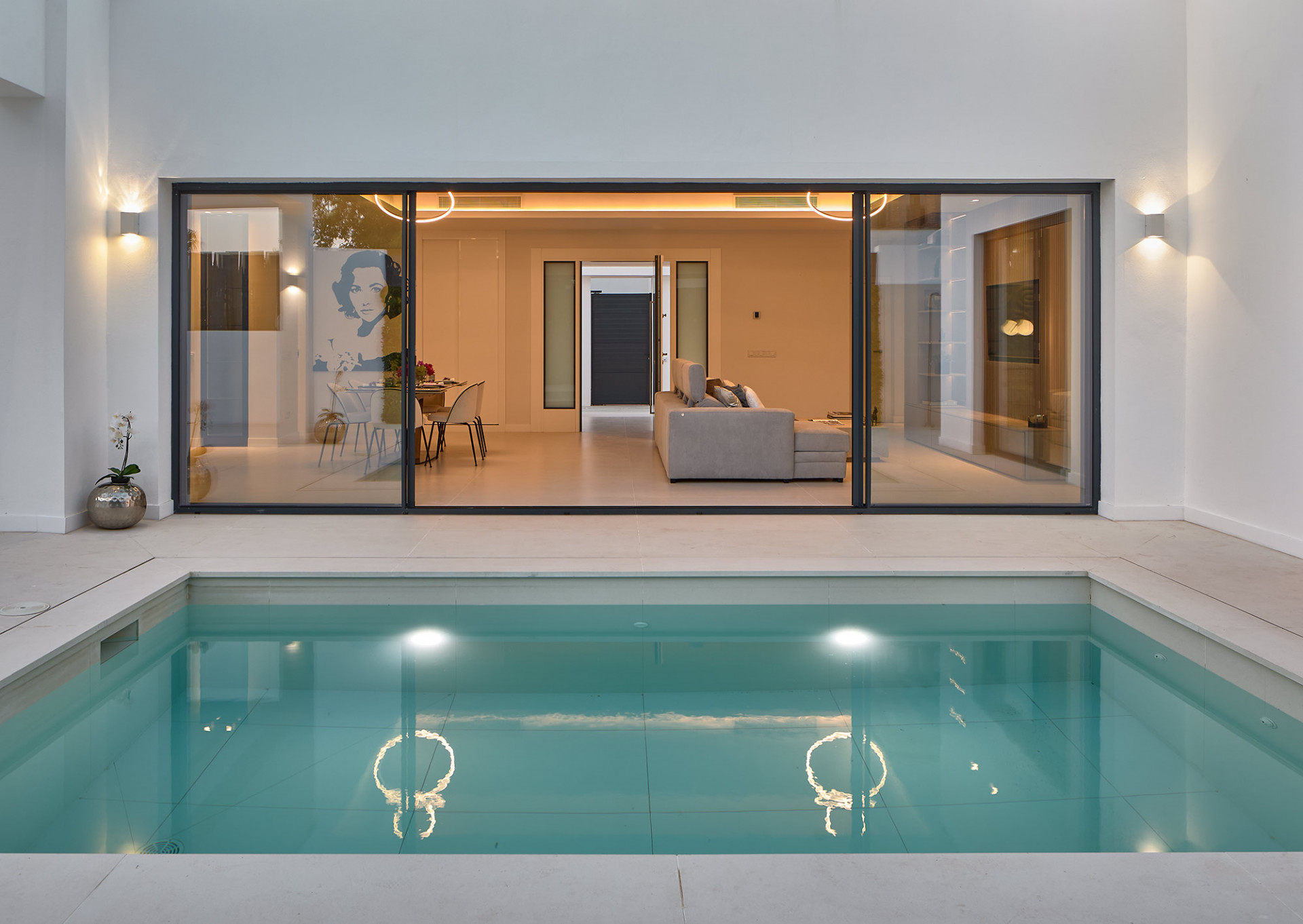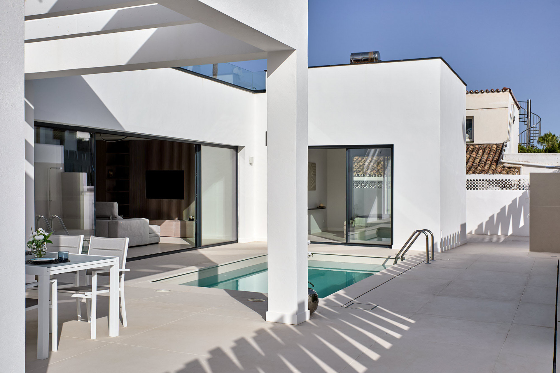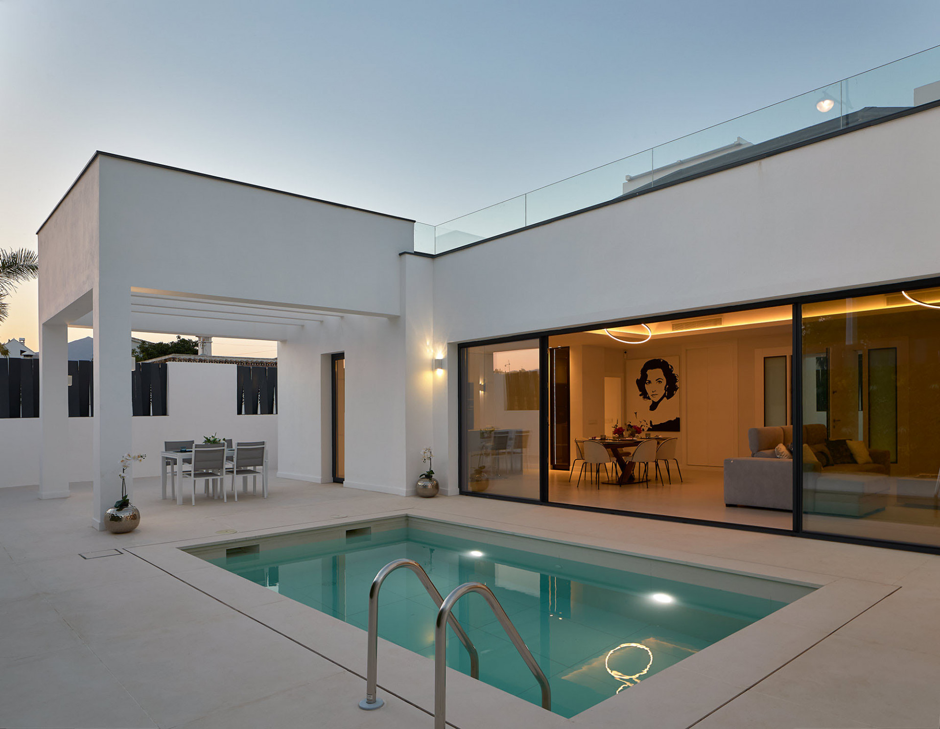 En el interior, la villa ofrece un espacio de una sola planta, donde los tres dormitorios se abren a la terraza privada y a la refrescante piscina de 8×4 m.