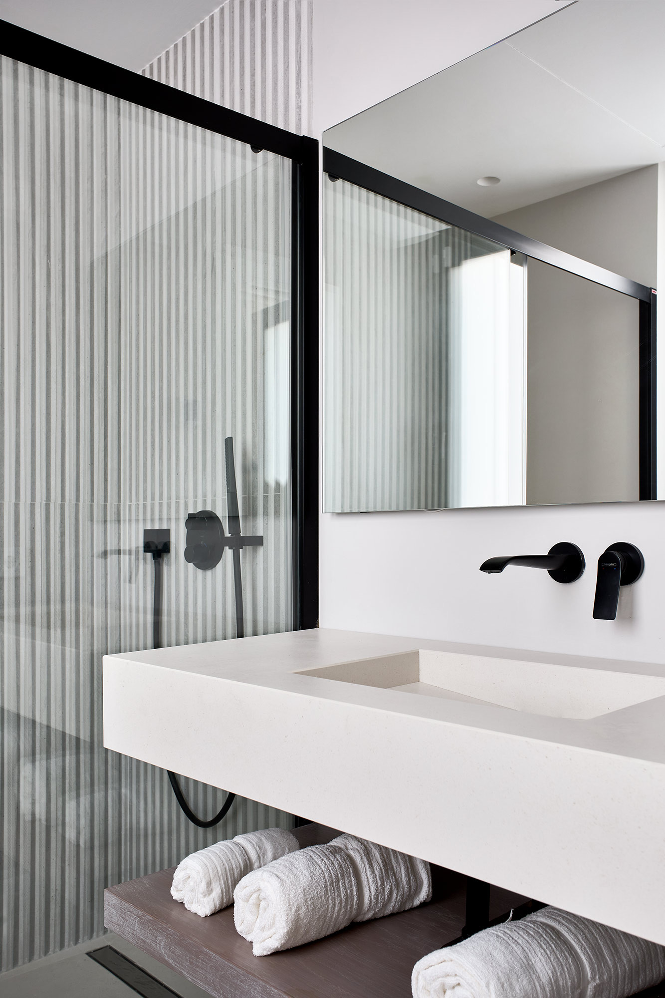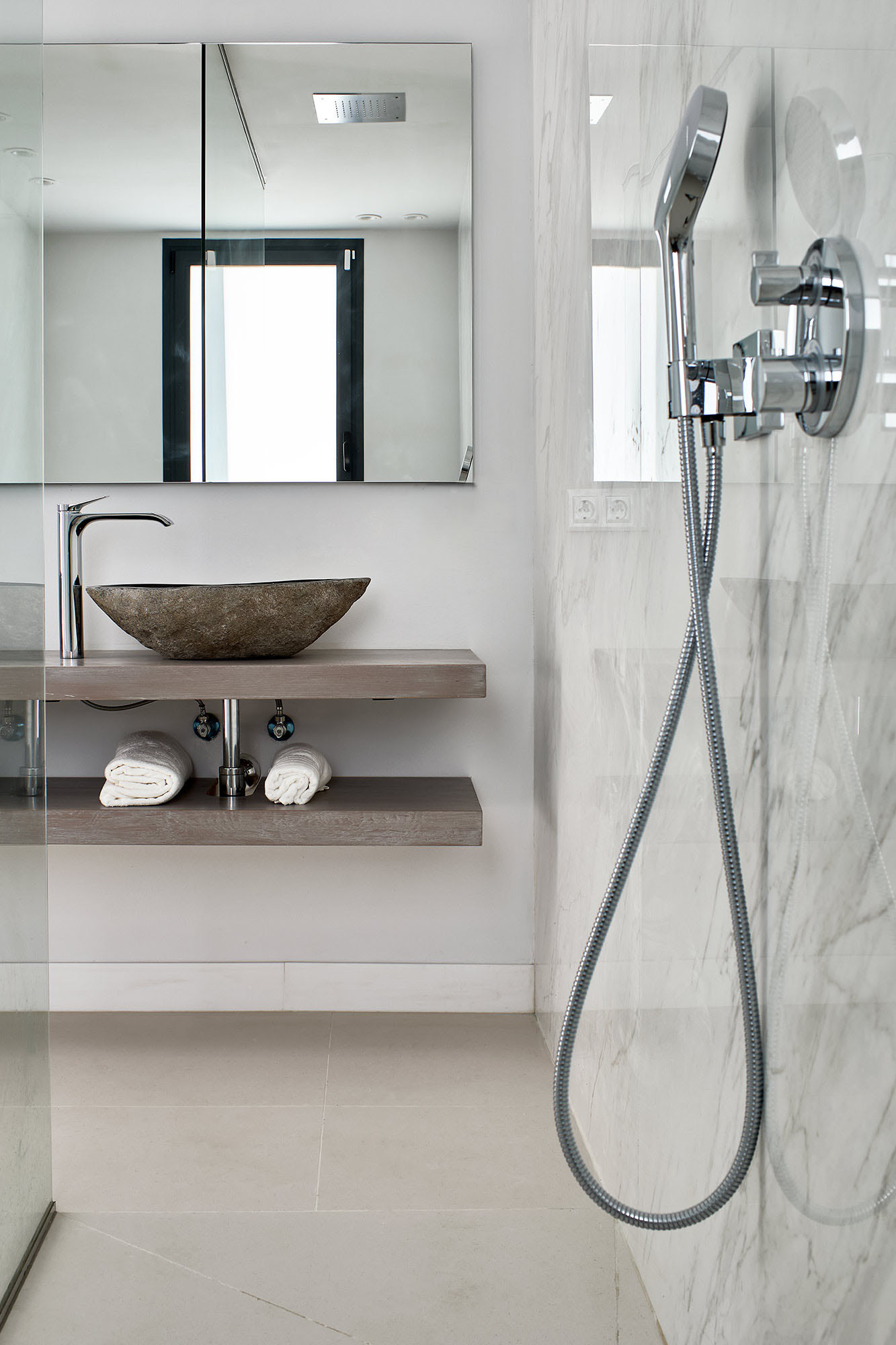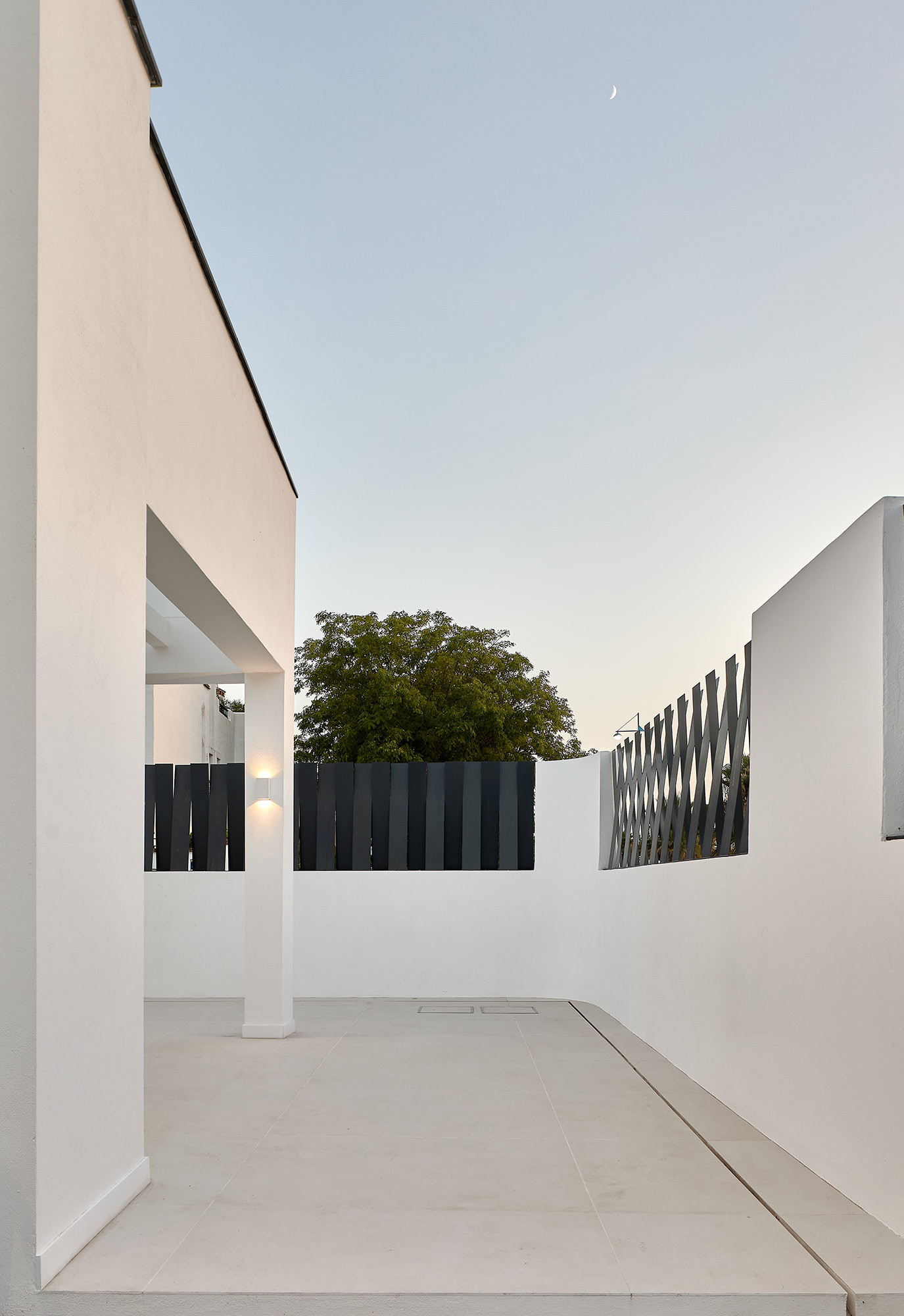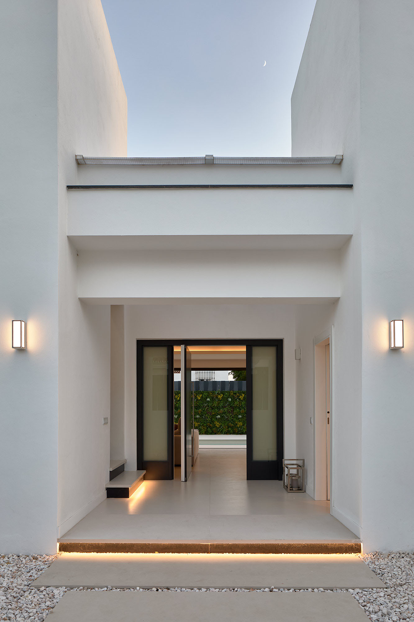 En el interior, la villa ofrece un espacio de una sola planta, donde los tres dormitorios se abren a la terraza privada y a la refrescante piscina de 8×4 m.