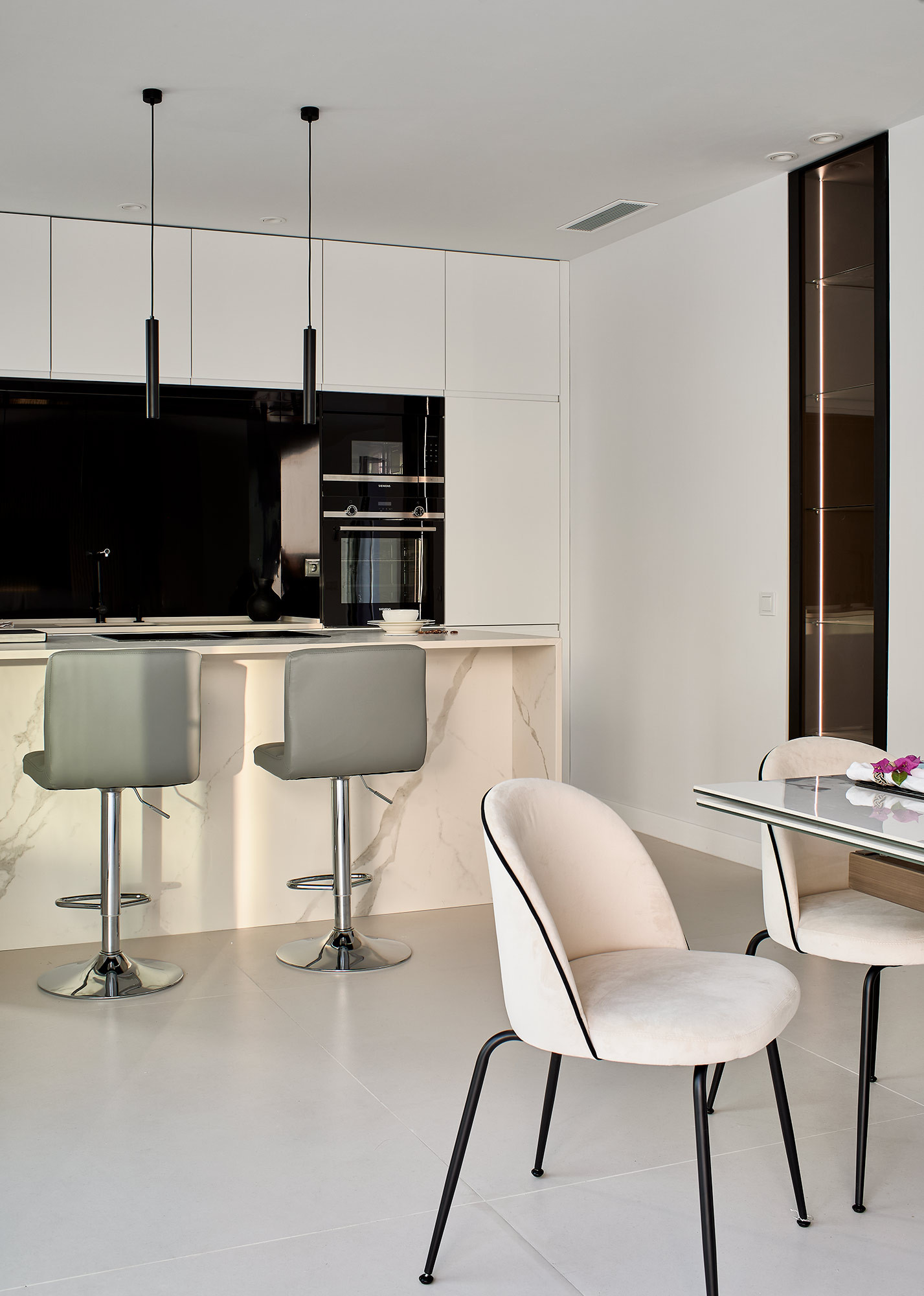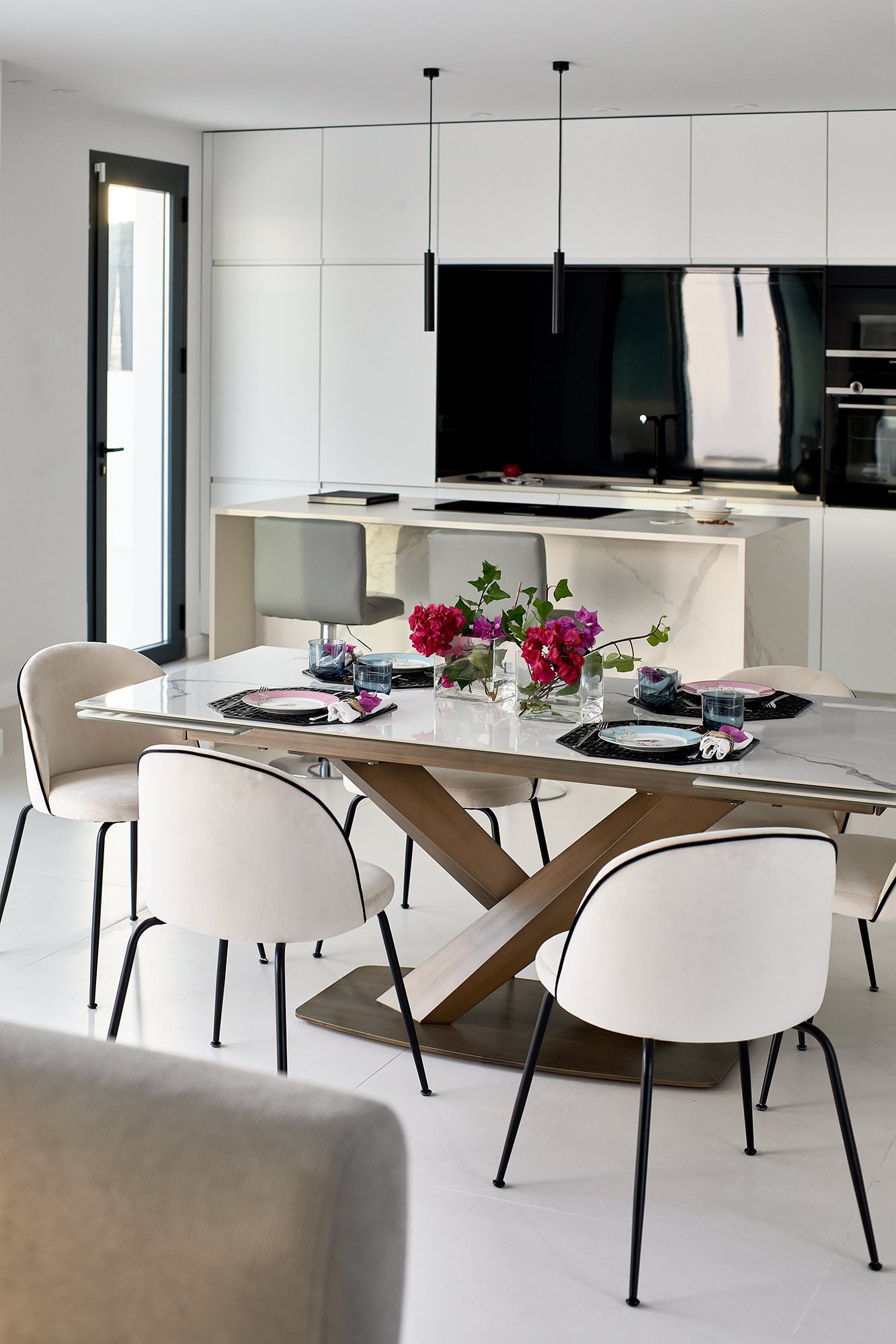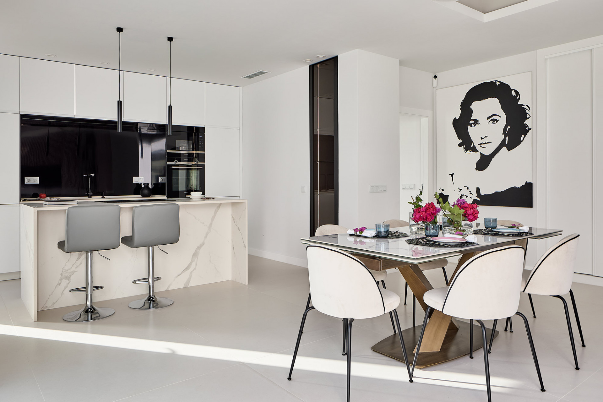 Los amplios dormitorios se complementan con tres baños completos y un discreto aseo de invitados. Los amantes de la cocina apreciarán la cocina totalmente equipada con electrodomésticos Siemens de alta calidad. Además, la propiedad incluye aparcamiento privado para dos coches