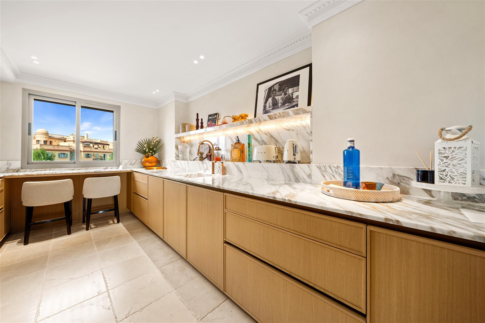 En el interior, el ático ha sido completamente rediseñado con un enfoque en la elegancia moderna y el confort. Materiales naturales, artesanía a medida y tecnología inteligente se combinan perfectamente para crear un ambiente cálido y sofisticado. Mobiliario hecho a mano, acabados en mármol e iluminación ambiental realzan cada espacio y crean una perfecta armonía entre la vida interior y exterior.