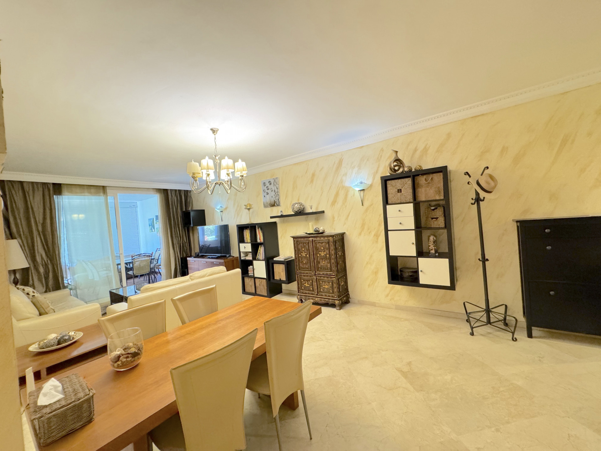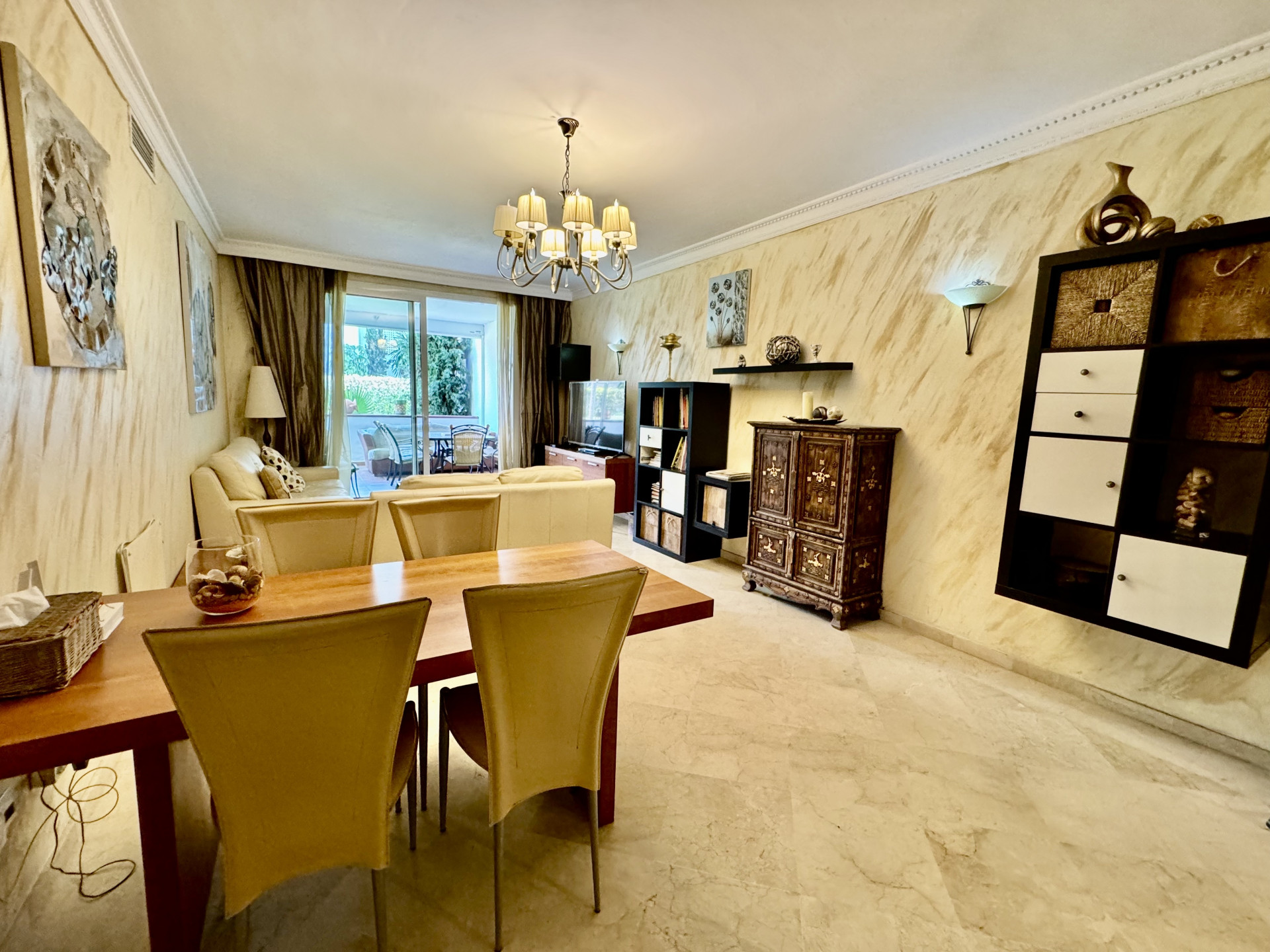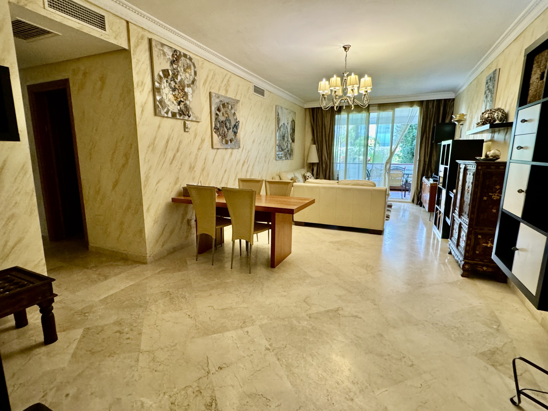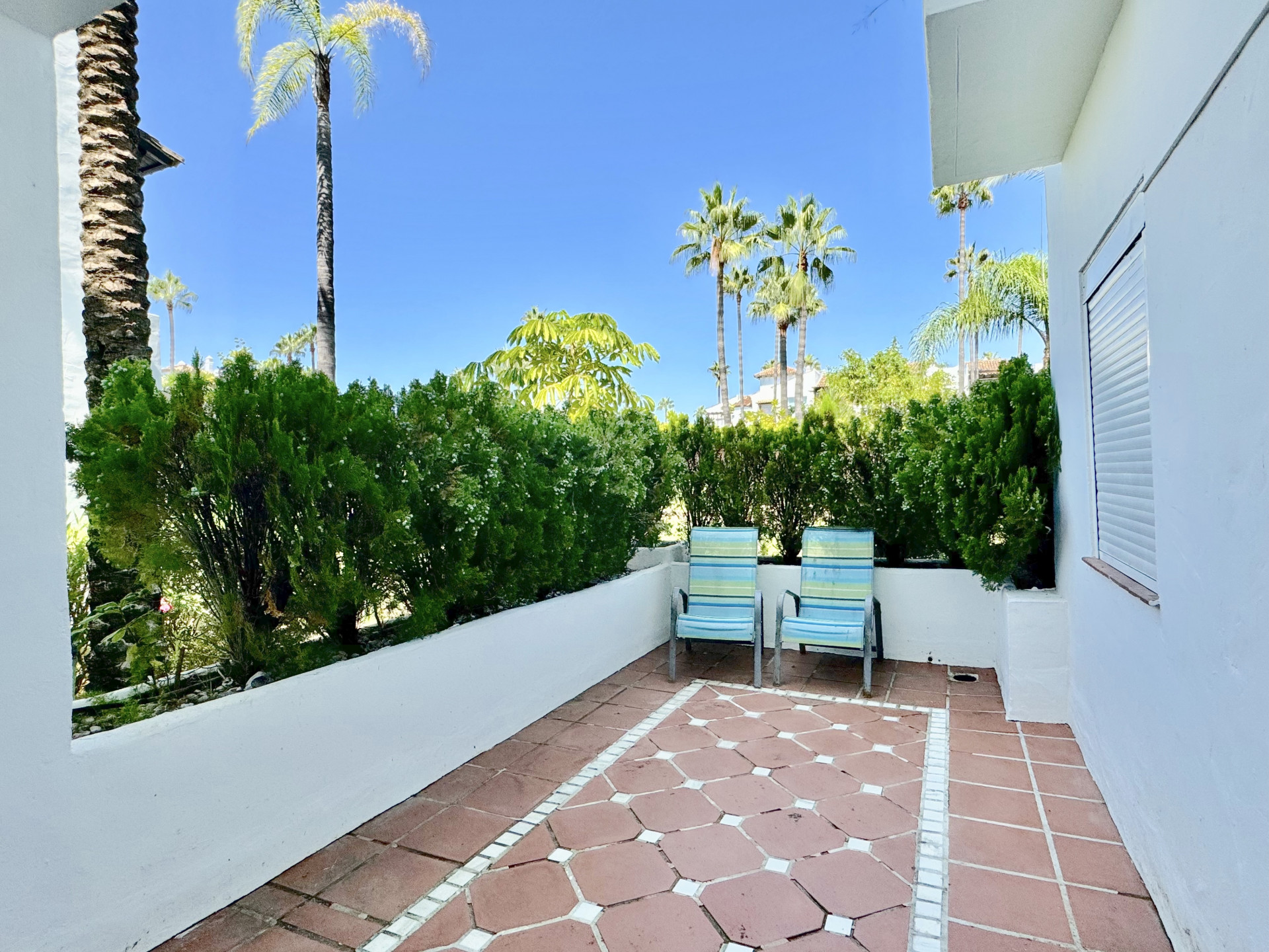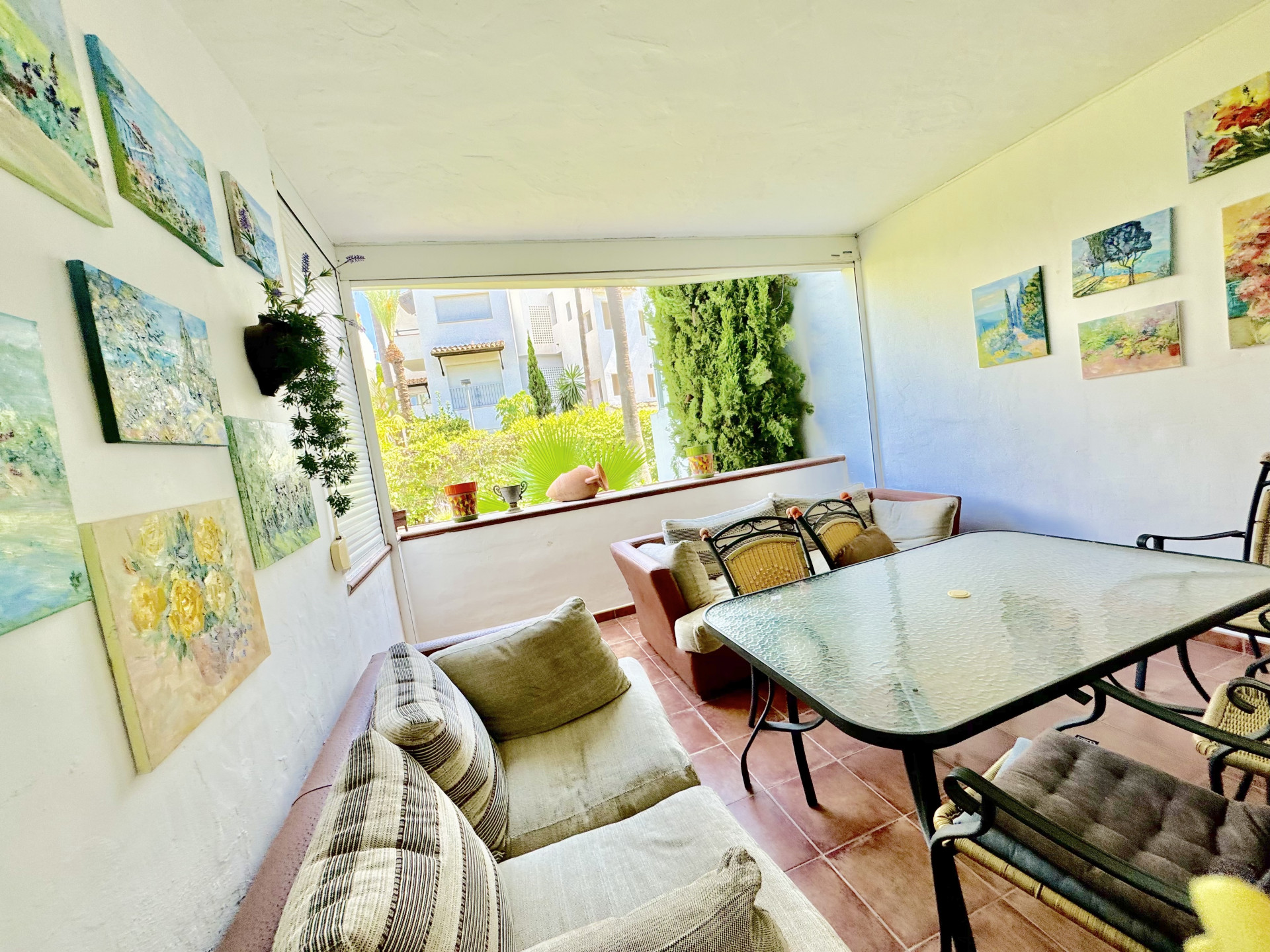 Le salon-salle à manger, grand et lumineux, s’étend aux différentes terrasses de l’appartement, créant une atmosphère parfaite pour profiter du climat méditerranéen. Au total, la propriété dispose de 3 terrasses, chacune offrant une vue exceptionnelle sur les jardins méditerranéens méticuleusement entretenus, offrant un endroit unique pour la détente et l’intimité. Ces terrasses sont l’endroit idéal pour profiter de repas en plein air, de lecture, ou tout simplement se détendre avec la douce brise marine.
