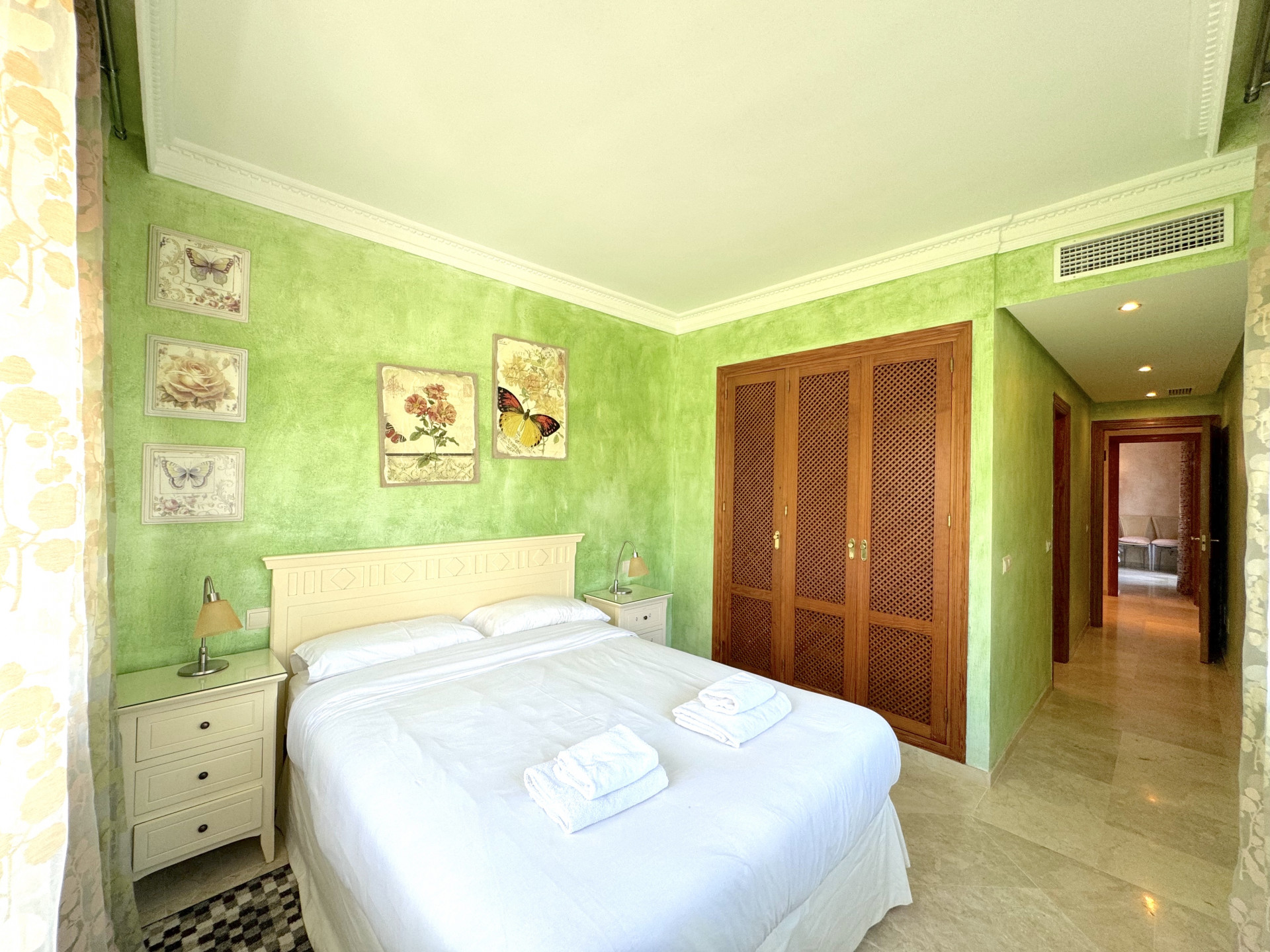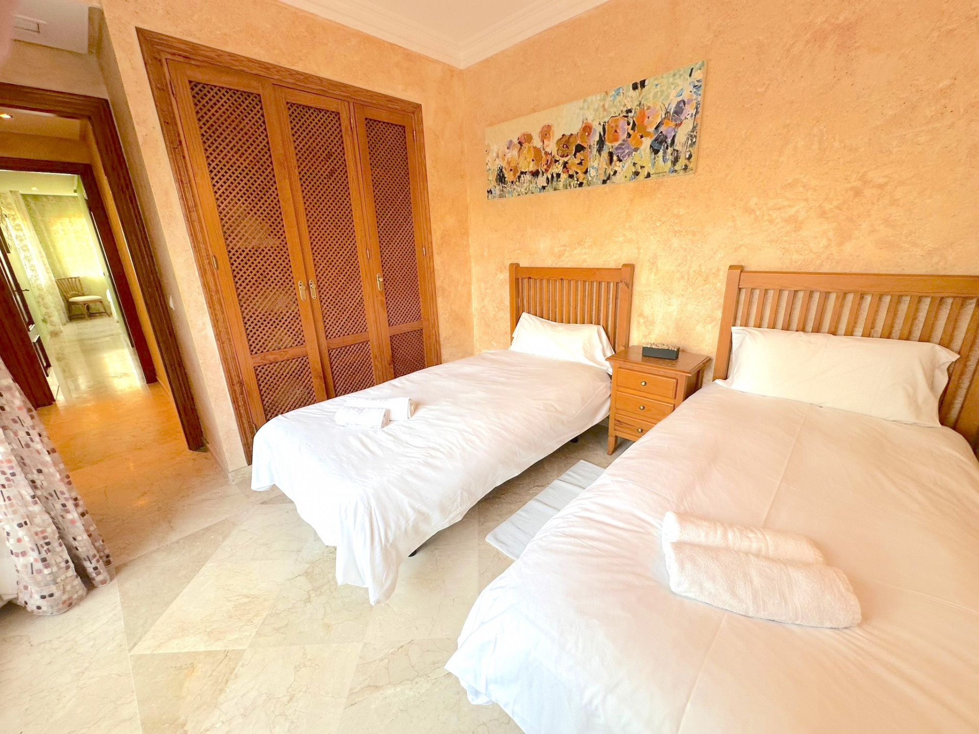 En entrant, vous sentez immédiatement l’espace et la luminosité grâce à la disposition bien pensée. L’appartement dispose de trois chambres, chacune de taille généreuse, idéale pour fournir un maximum de confort à ses résidents. La chambre principale dispose d’une salle de bains privative, avec des matériaux de haute qualité, y compris une douche moderne et une grande baignoire, créant l’espace parfait pour se détendre après une journée chargée. Les deux autres chambres disposent également de salles de bains privatives, assurant intimité et confort pour tous les membres de la famille.