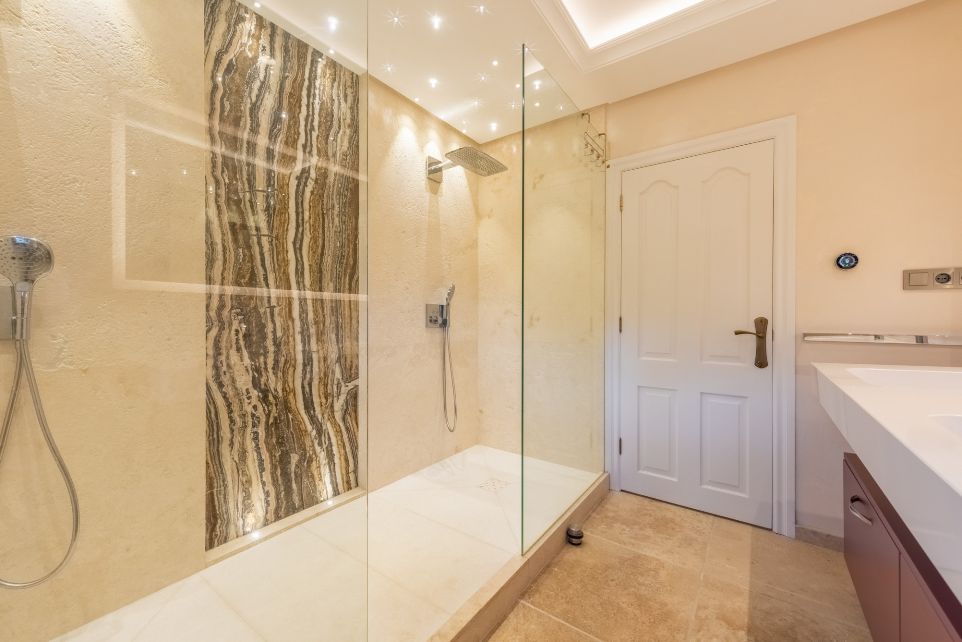 En descendant à l’étage inférieur, vous trouverez quatre chambres supplémentaires, toutes avec salle de bains privative et accès direct au jardin et à la piscine. A côté de la piscine, il y a une terrasse couverte complète avec un bar de piscine, parfait pour le divertissement et la détente en plein air.