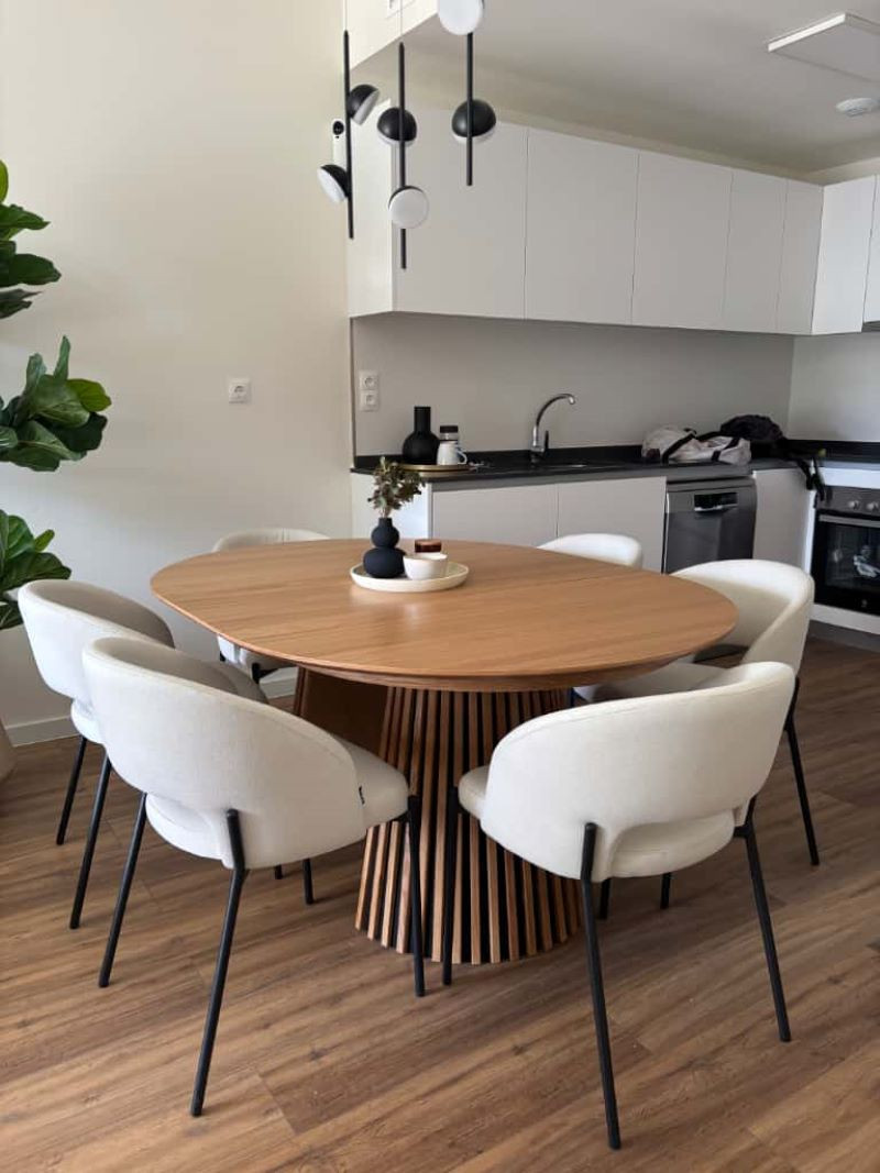 Otwarta przestrzeń dzienna z jadalnią, wyposażona w wysokiej klasy meble i płynnie łącząca wnętrze z otoczeniem.