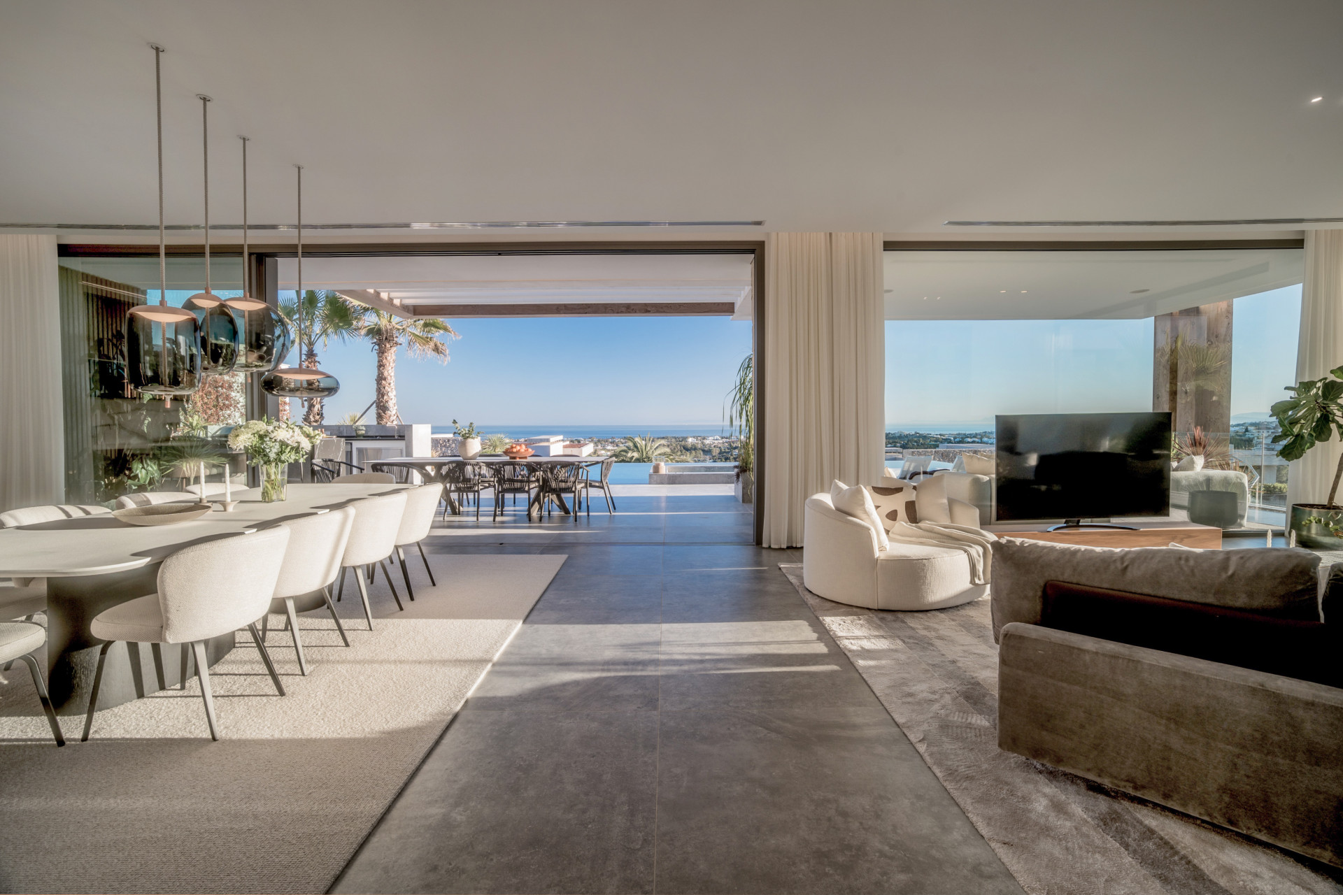 Od pierwszego momentu po przyjeździe wita Państwa niekończący się horyzont oraz zapierające dech w piersiach panoramiczne widoki rozciągające się od Morza Śródziemnego aż po wybrzeże Afryki. Współczesna architektura willi została zaprojektowana tak, aby maksymalnie wykorzystać to wyjątkowe położenie – otwarte wnętrza płynnie łączą się z otaczającym krajobrazem. Przeszklone ściany od podłogi do sufitu oraz przestronne strefy dzienne zapewniają harmonijny przepływ między wnętrzem a ogrodem, zalewając dom naturalnym światłem, świeżym powietrzem i niezakłóconymi widokami z każdego miejsca.
