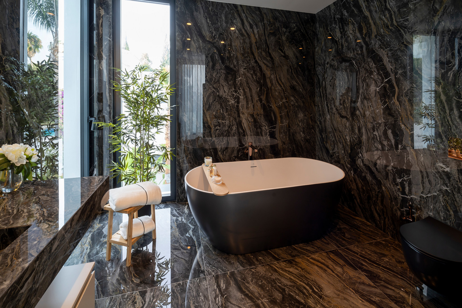 Outdoors, the villa is equally impressive. The landscaped gardens and multiple terraces provide ideal spaces for relaxation or hosting, while the infinity pool with cascading water feature and fully equipped al fresco kitchen elevate outdoor living. Panoramic views can be enjoyed from terraces and balconies throughout the home.