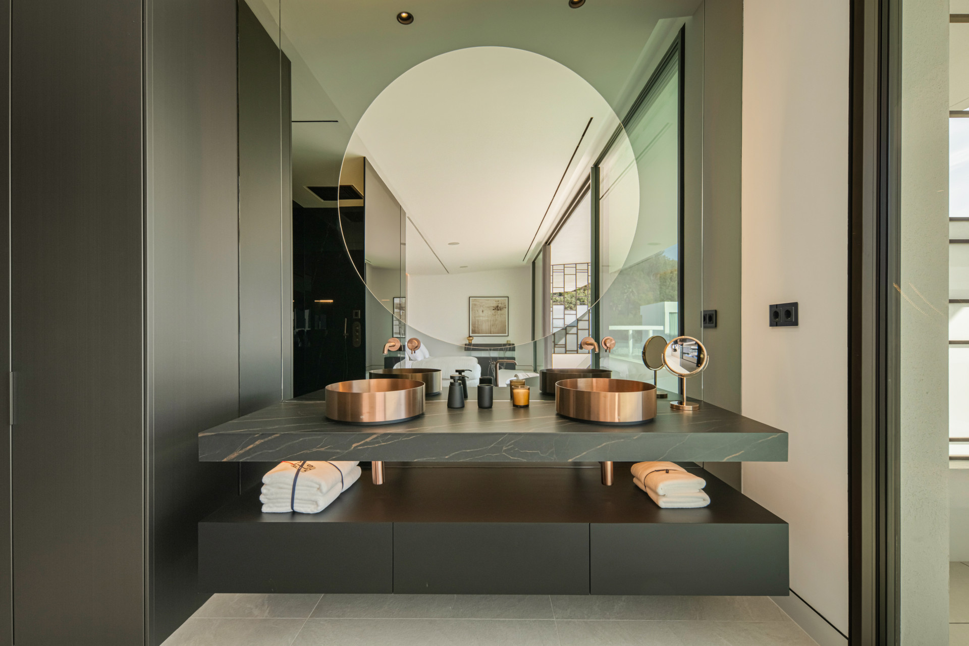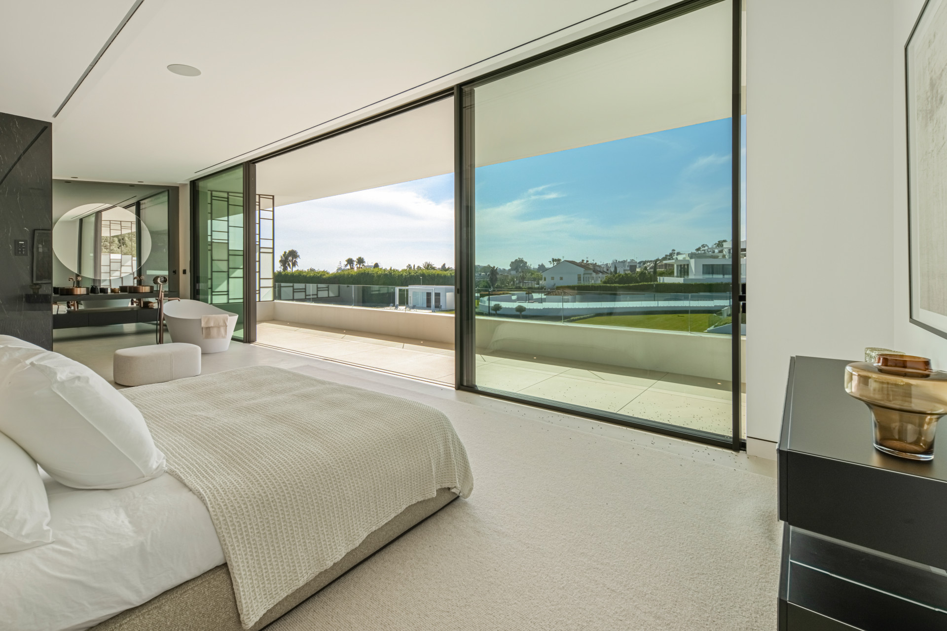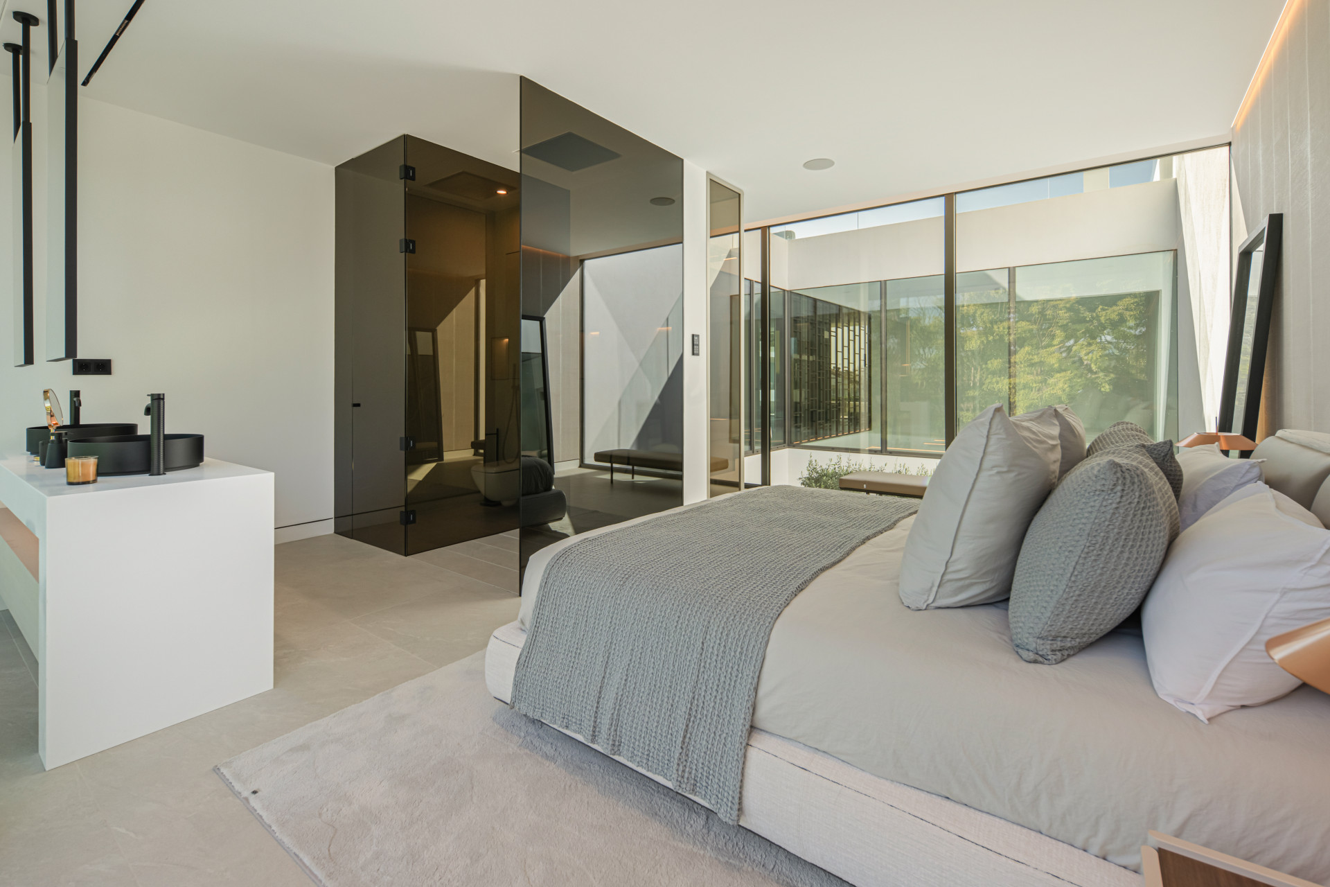 The villa’s striking design centres around a double-height living area and a central patio, allowing natural light to flood the interiors while creating a fluid connection between indoor spaces and outdoor terraces. The rooftop terrace provides an exceptional entertainment area complete with a private swimming pool and outdoor cinema, ideal for enjoying Marbella’s year-round climate.