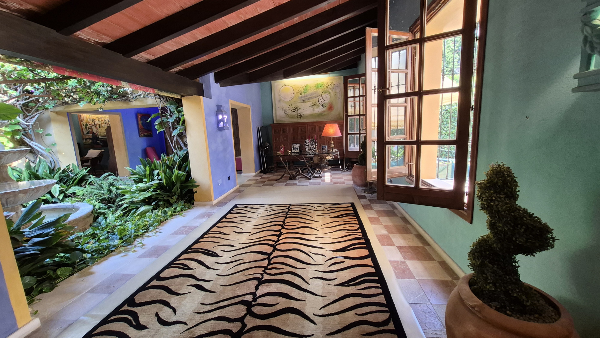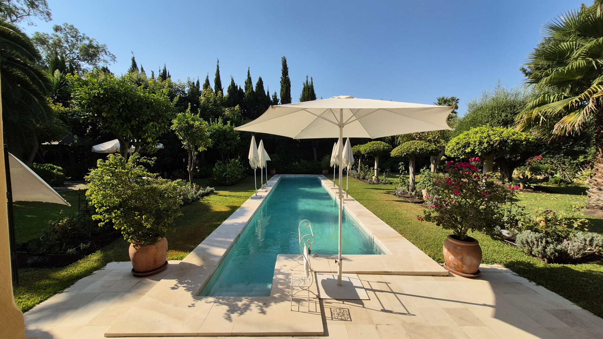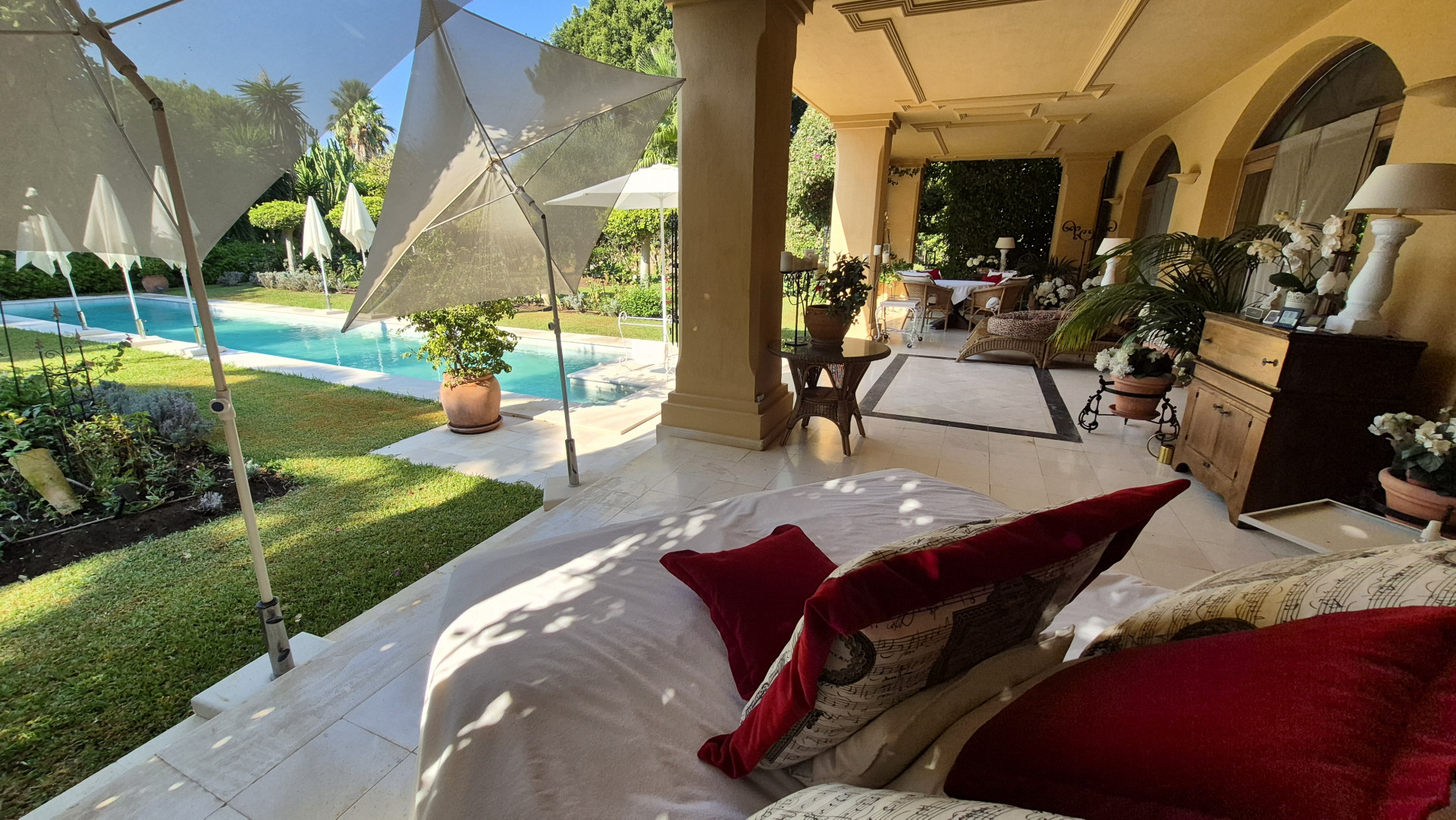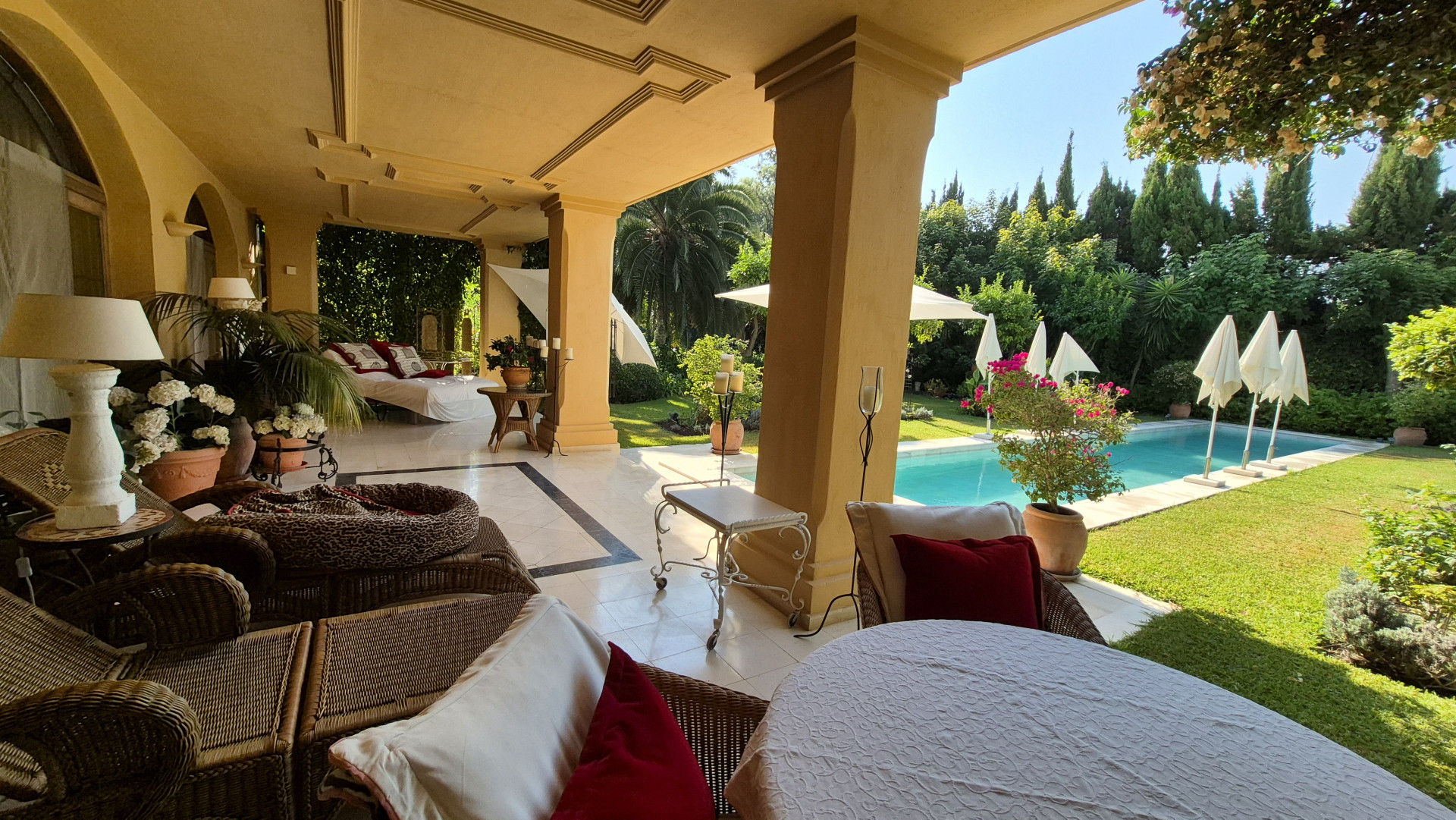 Designed for both family living and entertaining, the villa offers a variety of inviting spaces, from the elegant main salon to charming Andalusian patios and multiple terraces, creating a seamless indoor-outdoor lifestyle. The lush landscaped gardens, mature trees, and a solar-heated, chlorine-free swimming pool with jet stream further enhance the tranquil setting.