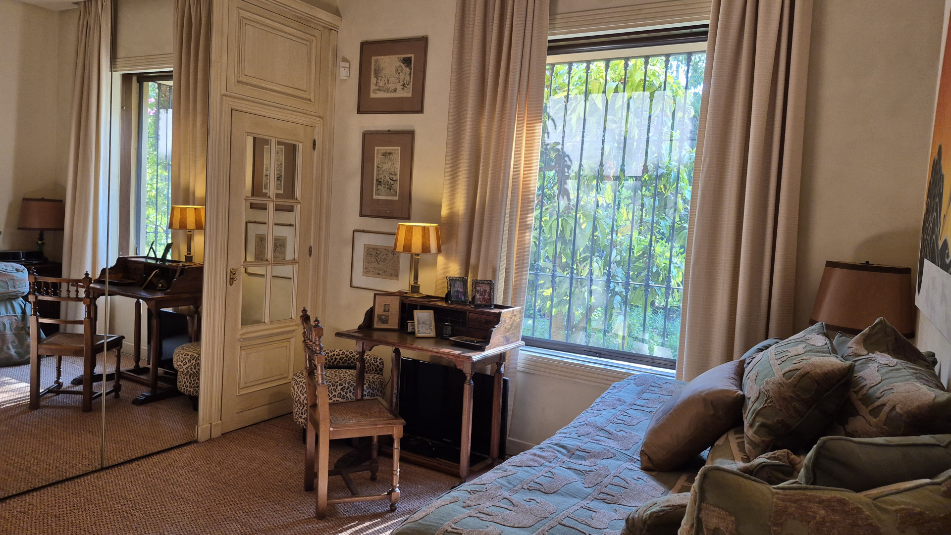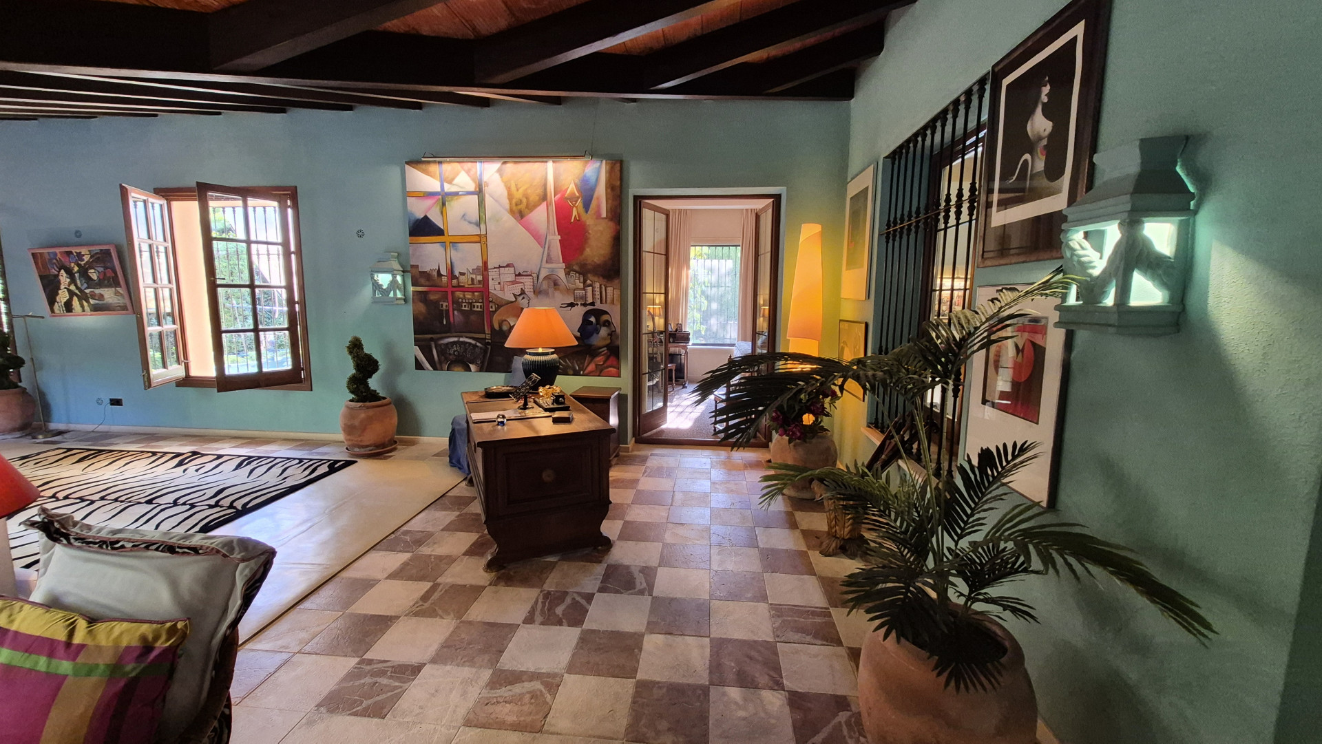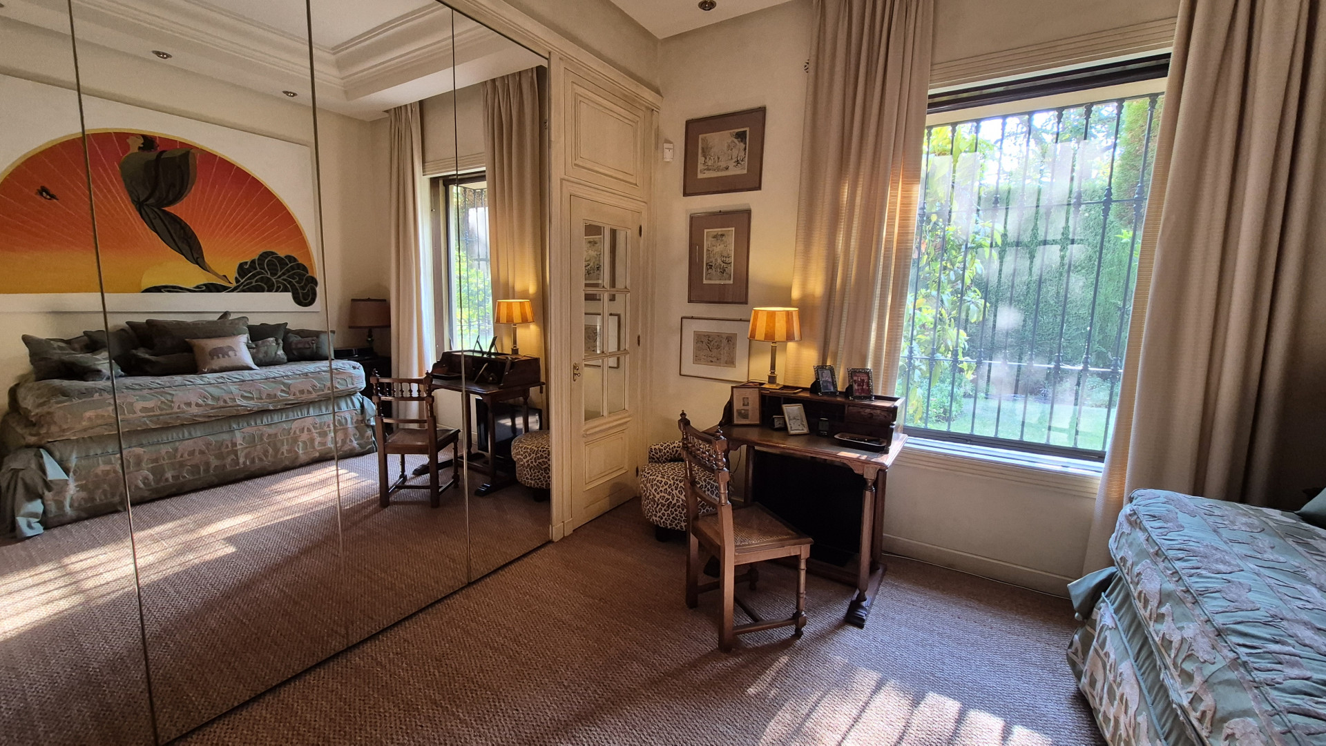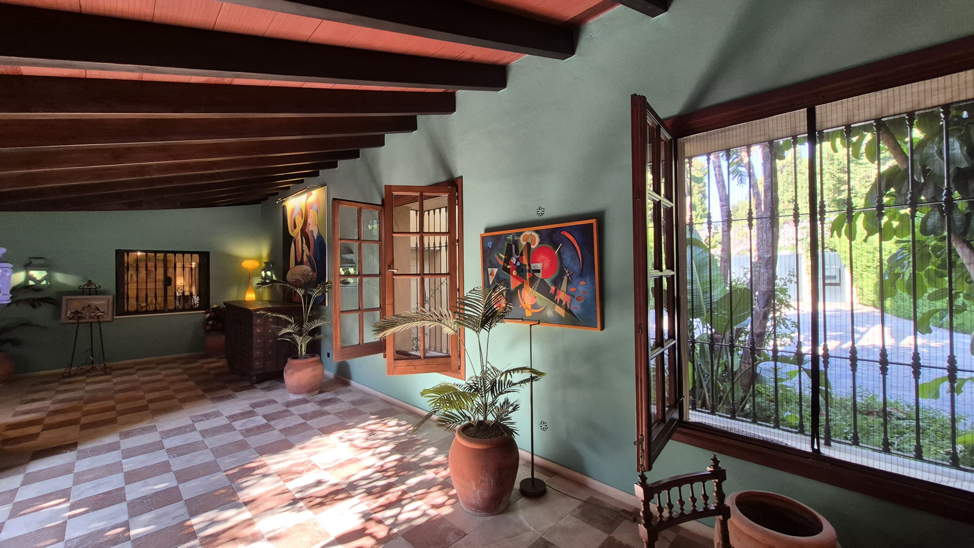 Designed for both family living and entertaining, the villa offers a variety of inviting spaces, from the elegant main salon to charming Andalusian patios and multiple terraces, creating a seamless indoor-outdoor lifestyle. The lush landscaped gardens, mature trees, and a solar-heated, chlorine-free swimming pool with jet stream further enhance the tranquil setting.