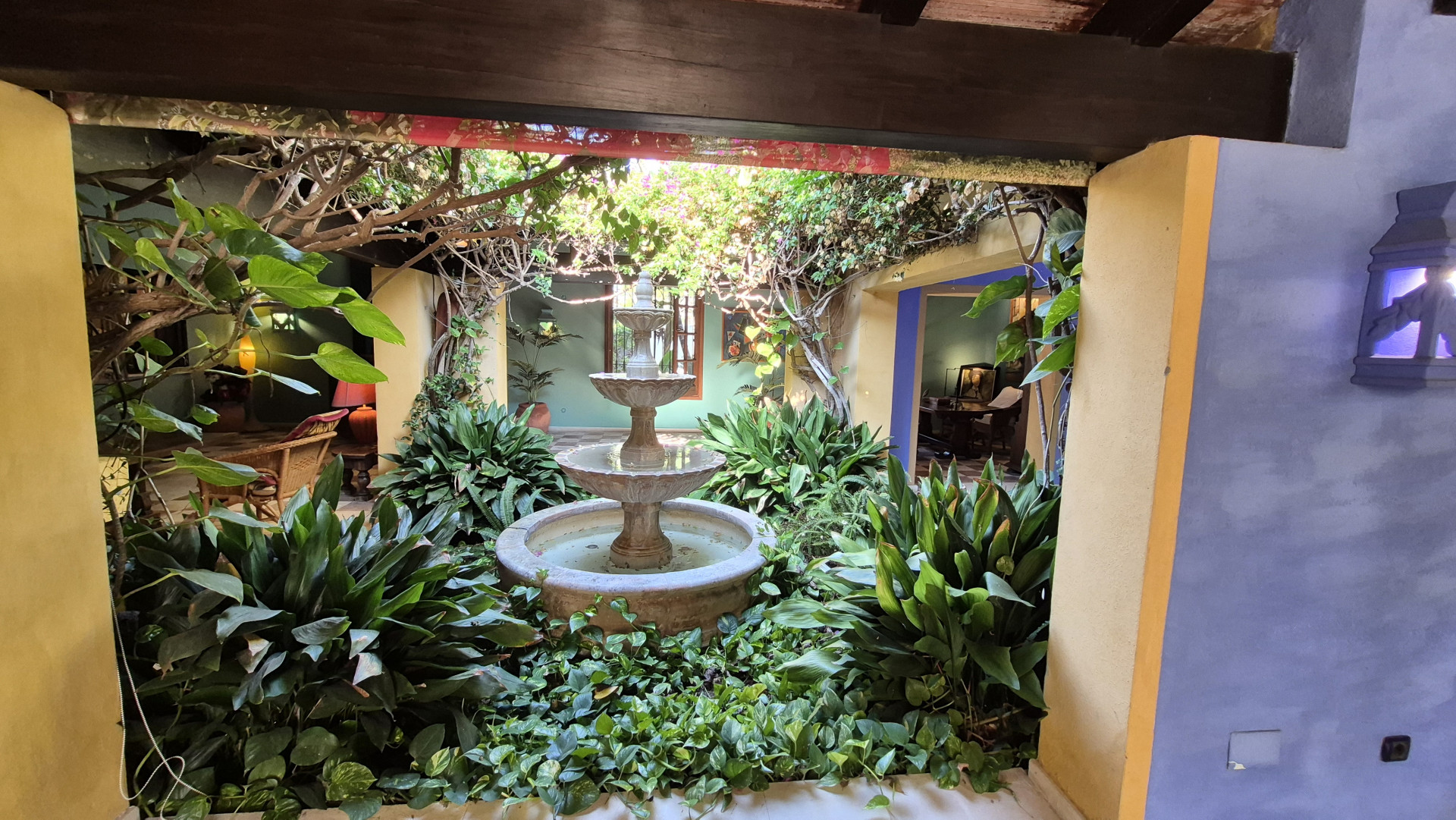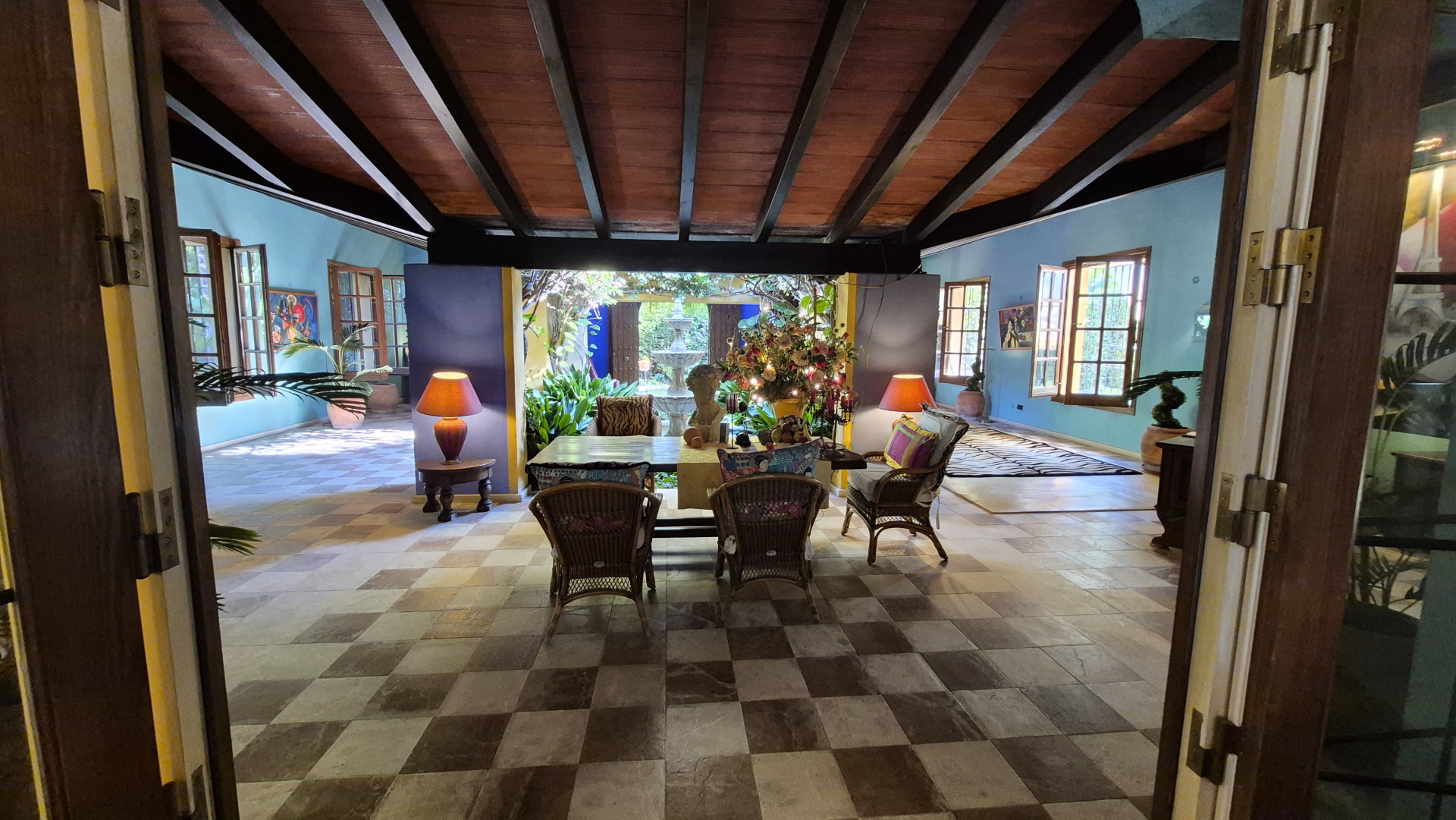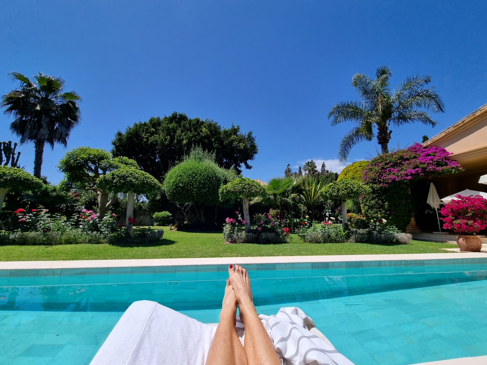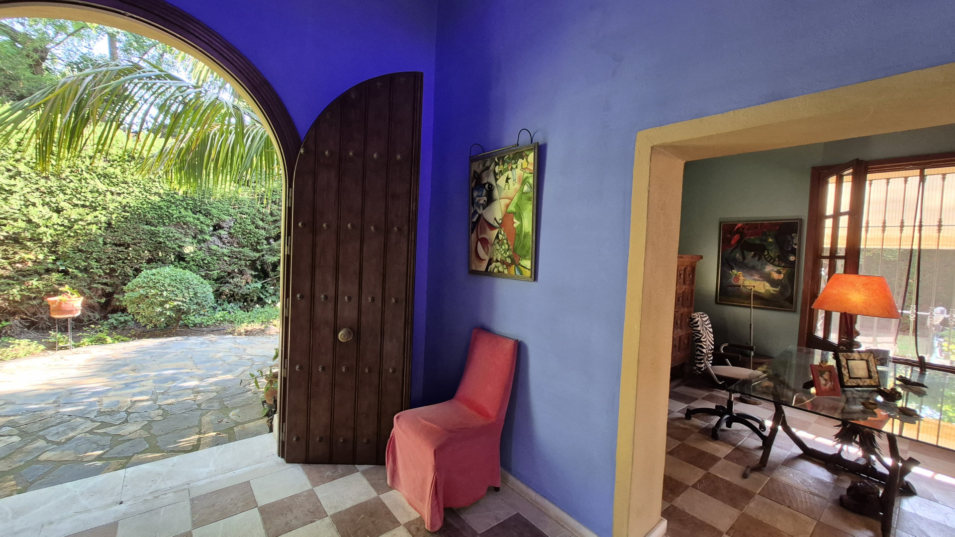 Designed for both family living and entertaining, the villa offers a variety of inviting spaces, from the elegant main salon to charming Andalusian patios and multiple terraces, creating a seamless indoor-outdoor lifestyle. The lush landscaped gardens, mature trees, and a solar-heated, chlorine-free swimming pool with jet stream further enhance the tranquil setting.