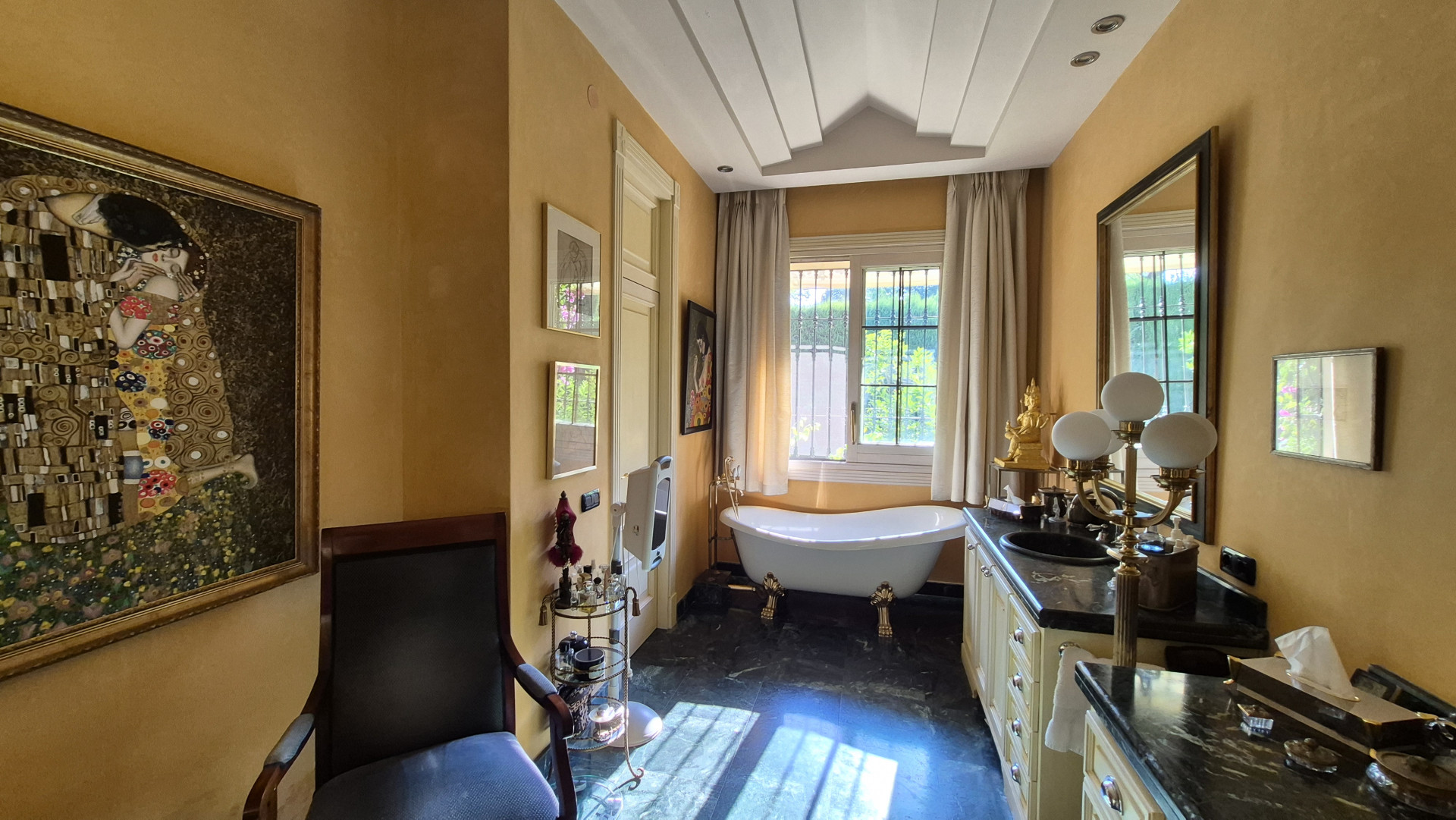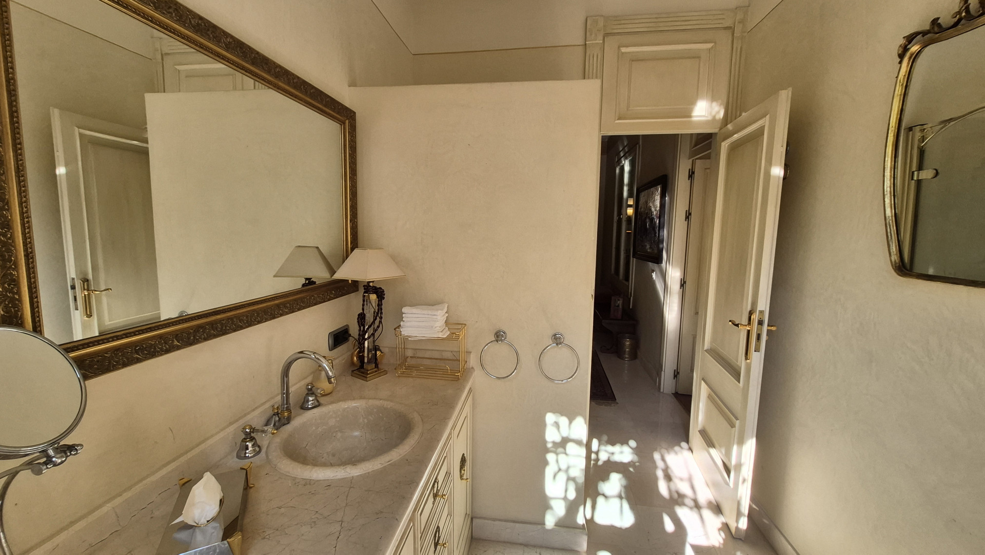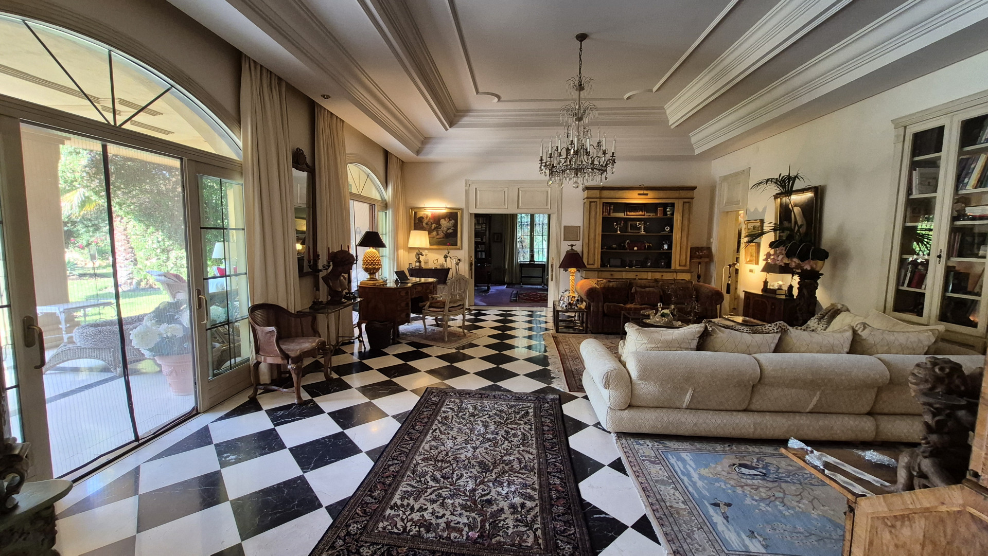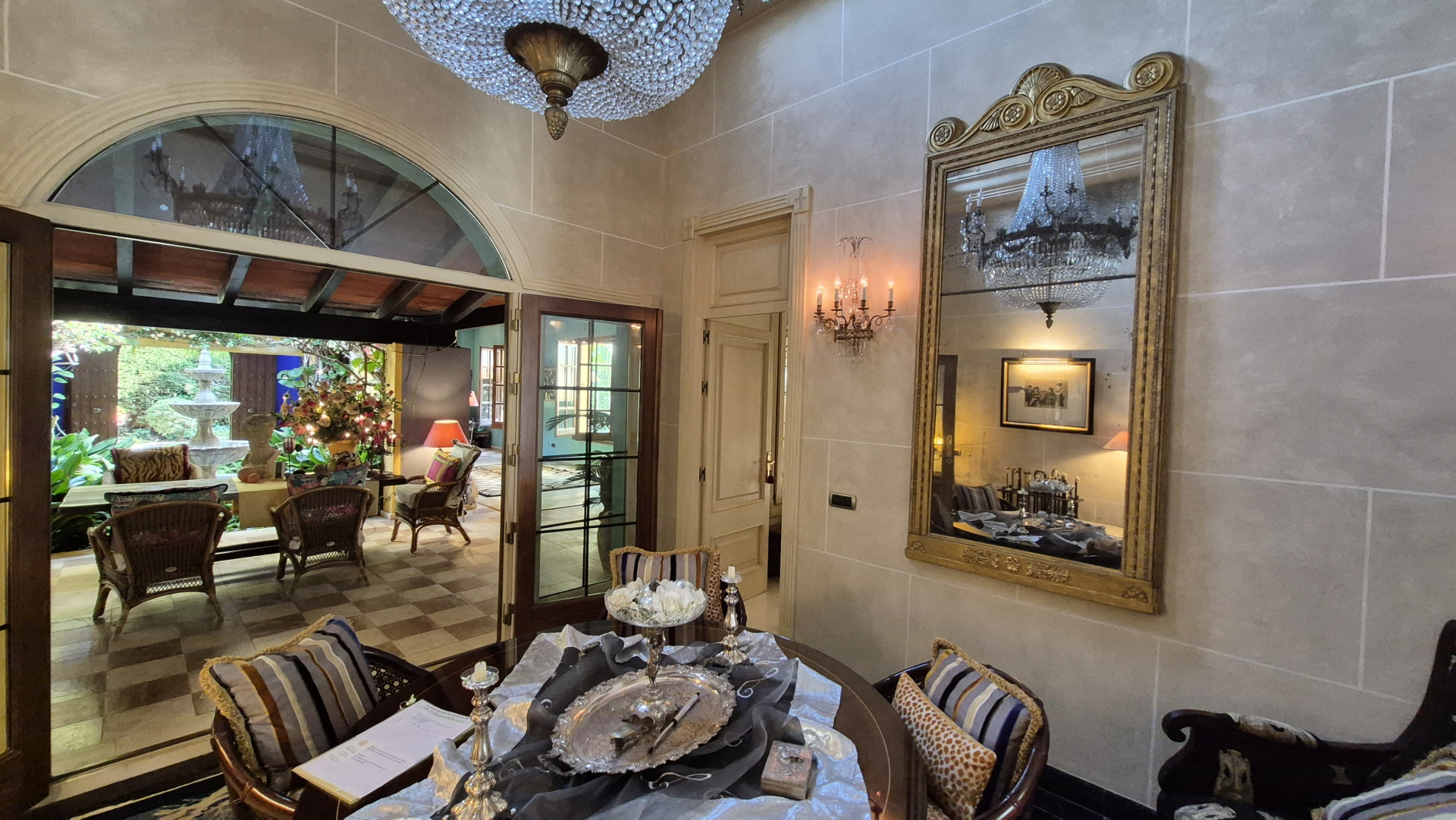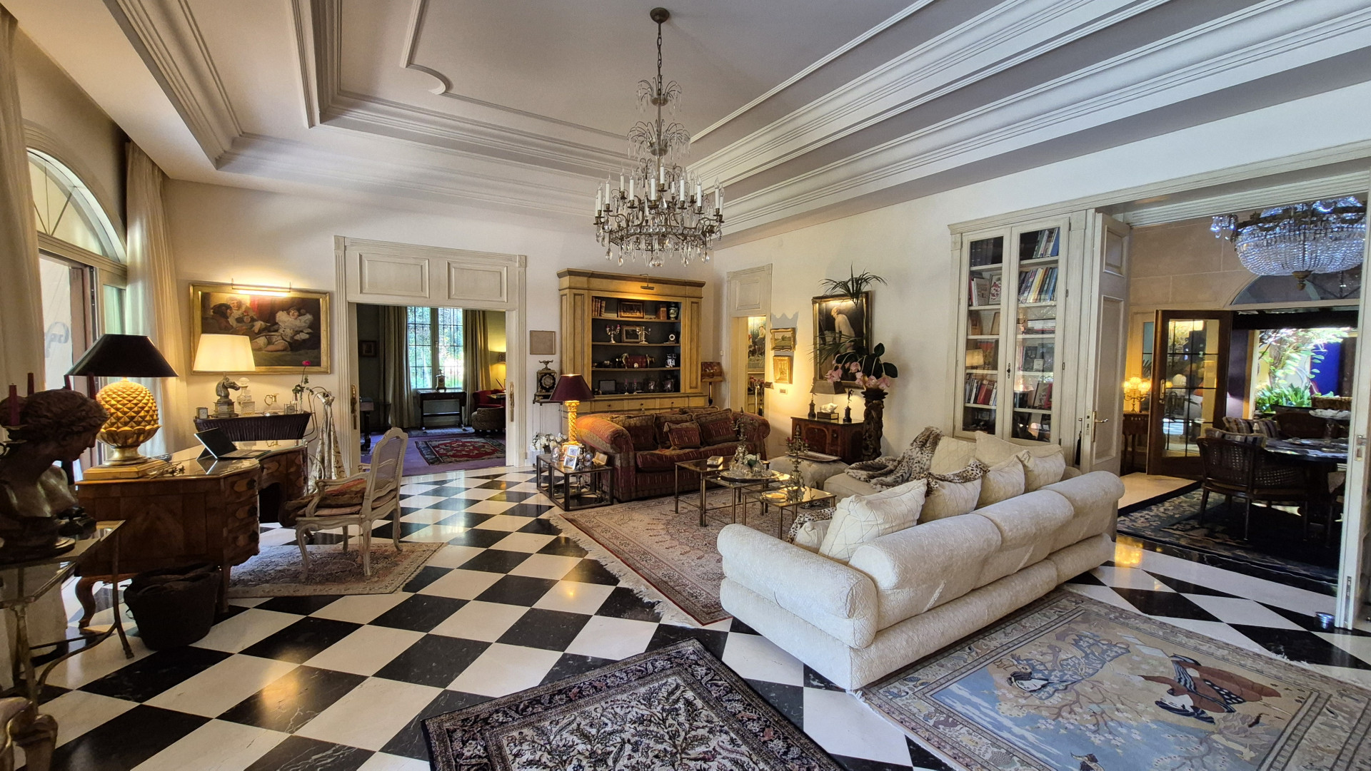 The interiors are defined by high ceilings and exquisite craftsmanship, including an impressive 8-metre-high ceiling in the dining room, enhancing the sense of grandeur and light. Marble floors, traditional architectural details, and carefully curated finishes reflect timeless quality and style.