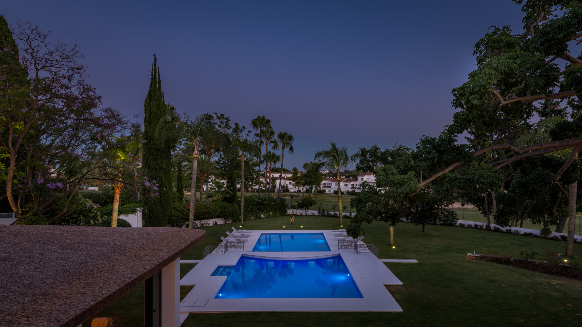 Outside, the villa boasts a large swimming pool with an elevated section and waterfall feature, surrounded by manicured lawns and mature trees for privacy. Multiple seating and dining areas, including a tiled courtyard with a decorative fountain, invite year-round enjoyment of Marbella’s climate. Expansive glass walls and terraces create an easy indoor-outdoor flow. Notably, the property offers one of the rare direct entrances to Los Naranjos Golf, with thoughtfully designed pathways wide enough for a golf buggy.