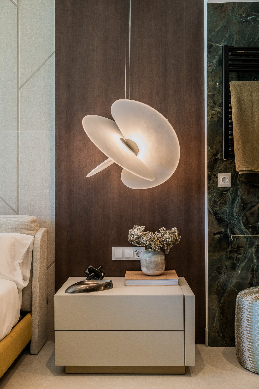 Featuring high-end finishes throughout, the apartment boasts elegant flooring, bespoke furnishings, and natural fabrics that radiate sophistication. The open-plan designer kitchen is fitted with premium German appliances, while additional luxury touches like custom wardrobes, a Bang & Olufsen sound system, underfloor heating, and an electric fireplace elevate the living experience.