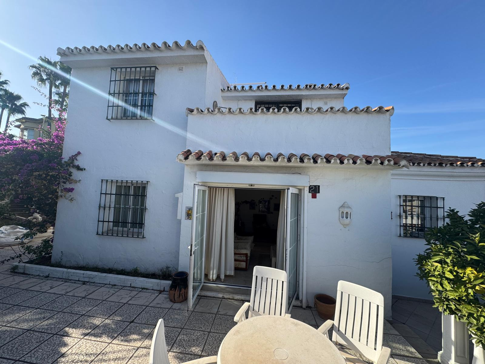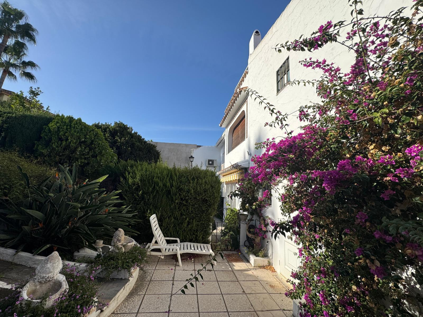 This charming townhouse for sale in Estepona is located in the sought-after residential complex Mar y Monte, perfectly positioned between San Pedro de Alcántara and Estepona town. Set on a corner plot, the property enjoys extra privacy, a wrap-around patio and garden, and two entrances — one from the quiet outside street and one directly from within the gated community.