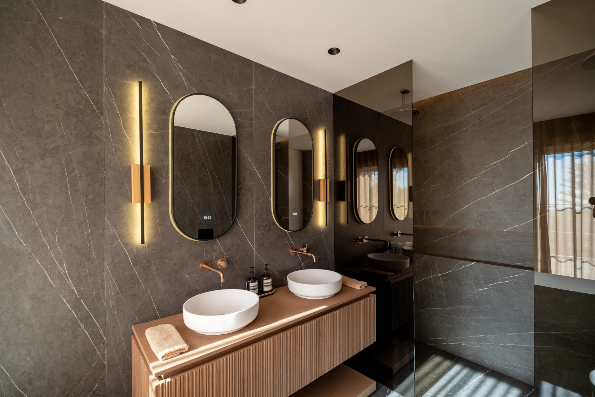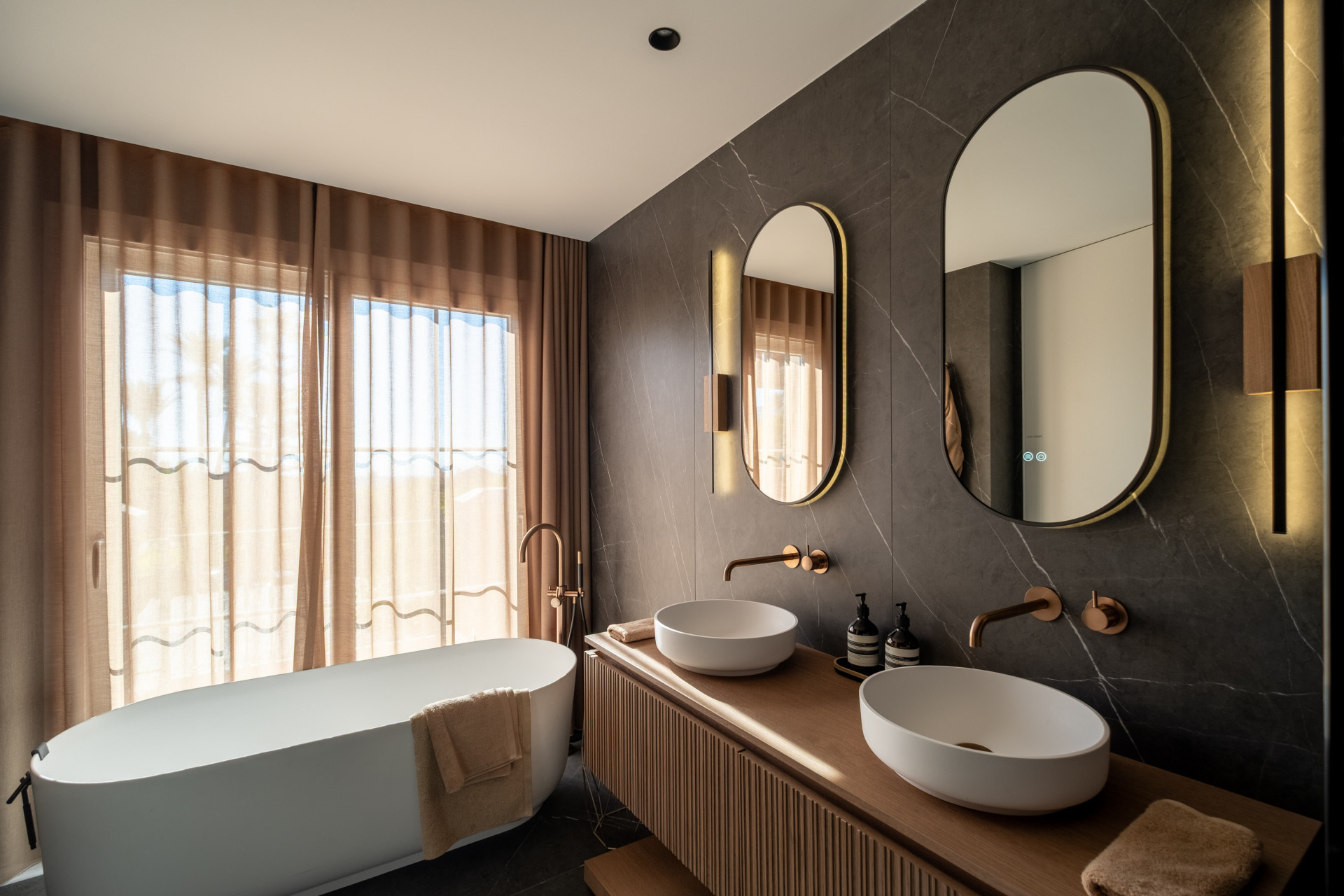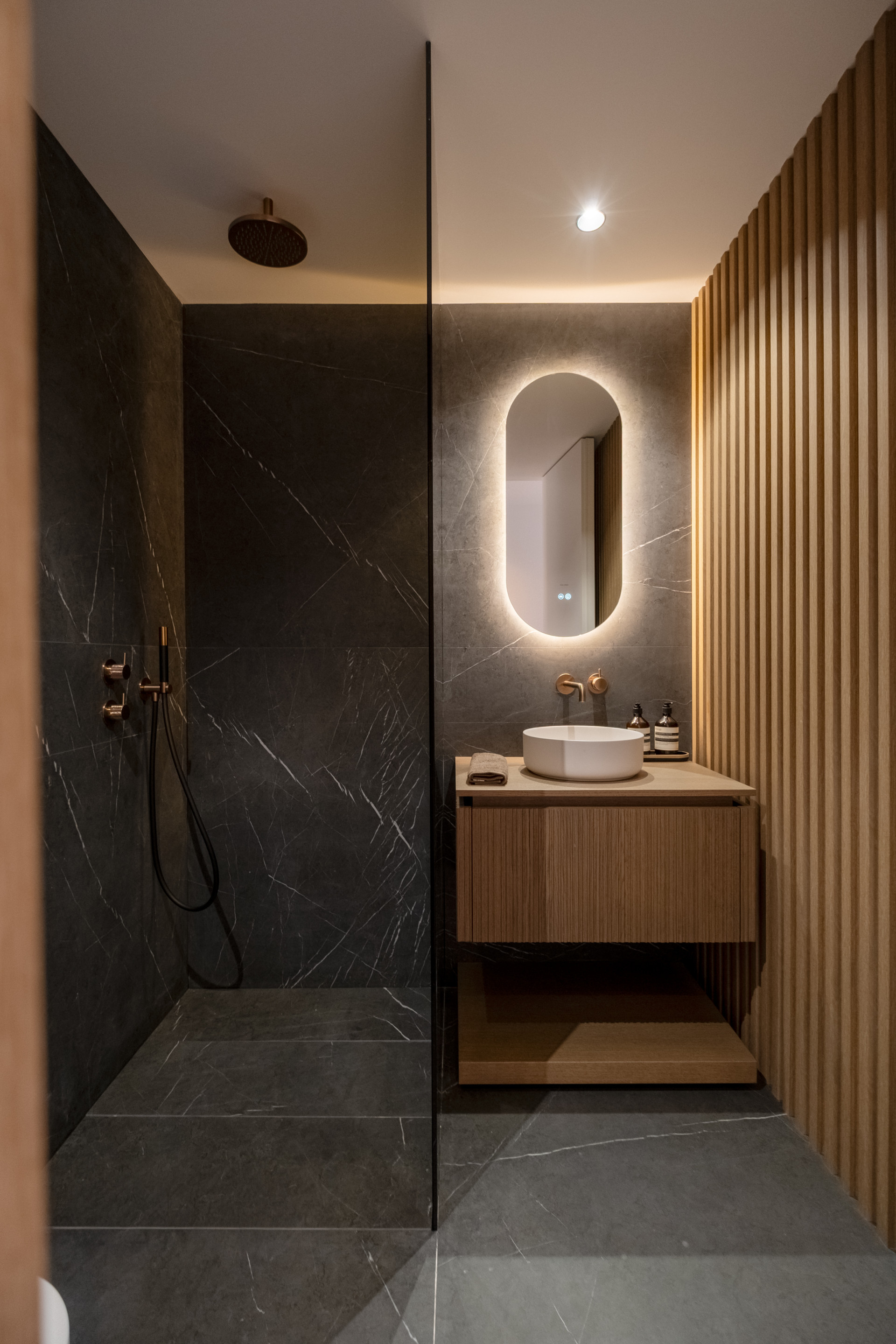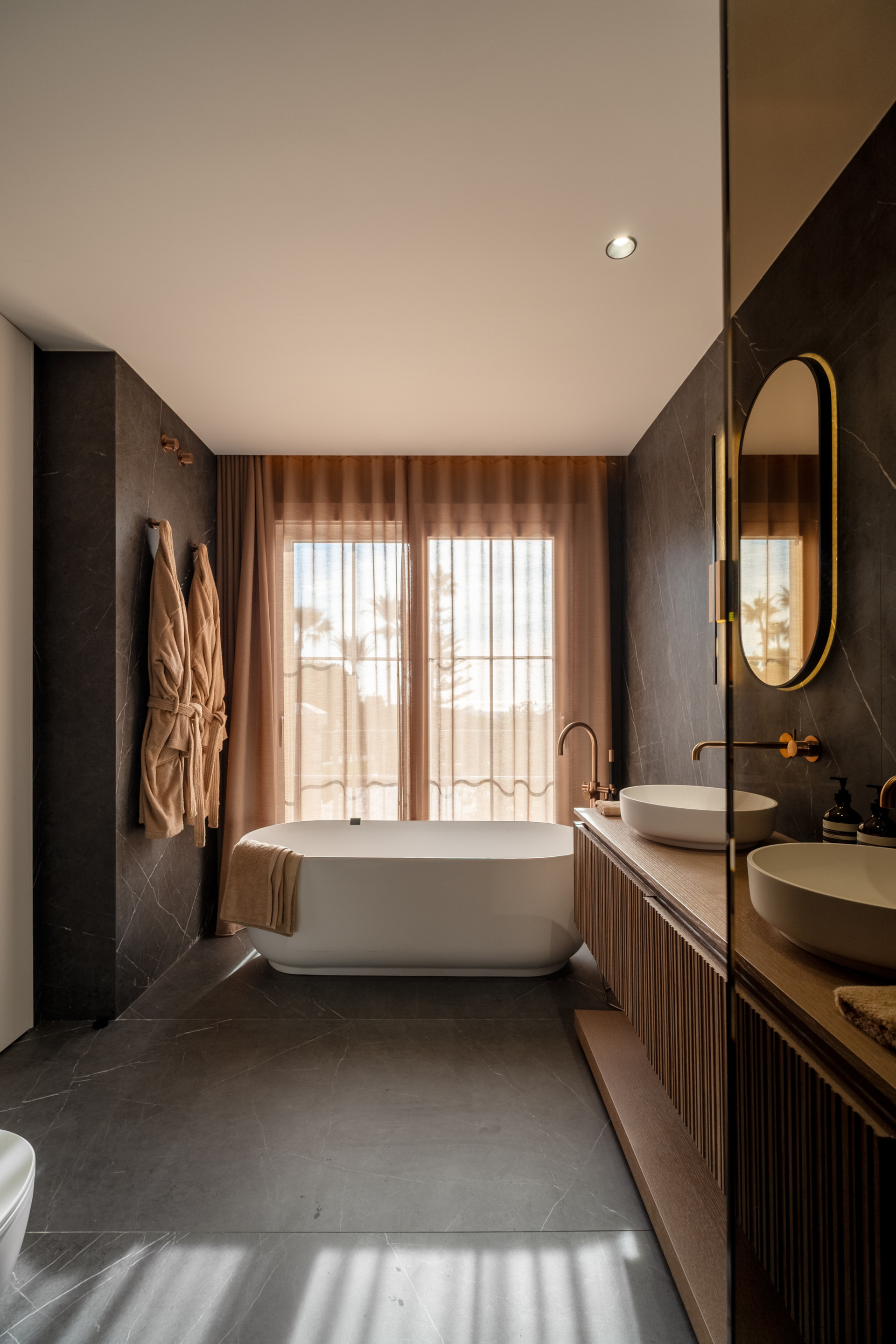 The property features three spacious bedrooms, each with its own en-suite bathroom. The interior design blends abundant natural light with a rich palette of dark wood and grey stone, crafting an atmosphere of elegance and comfort. Floor-to-ceiling sliding doors open fully to the terrace, enhancing the connection between indoor and outdoor living.