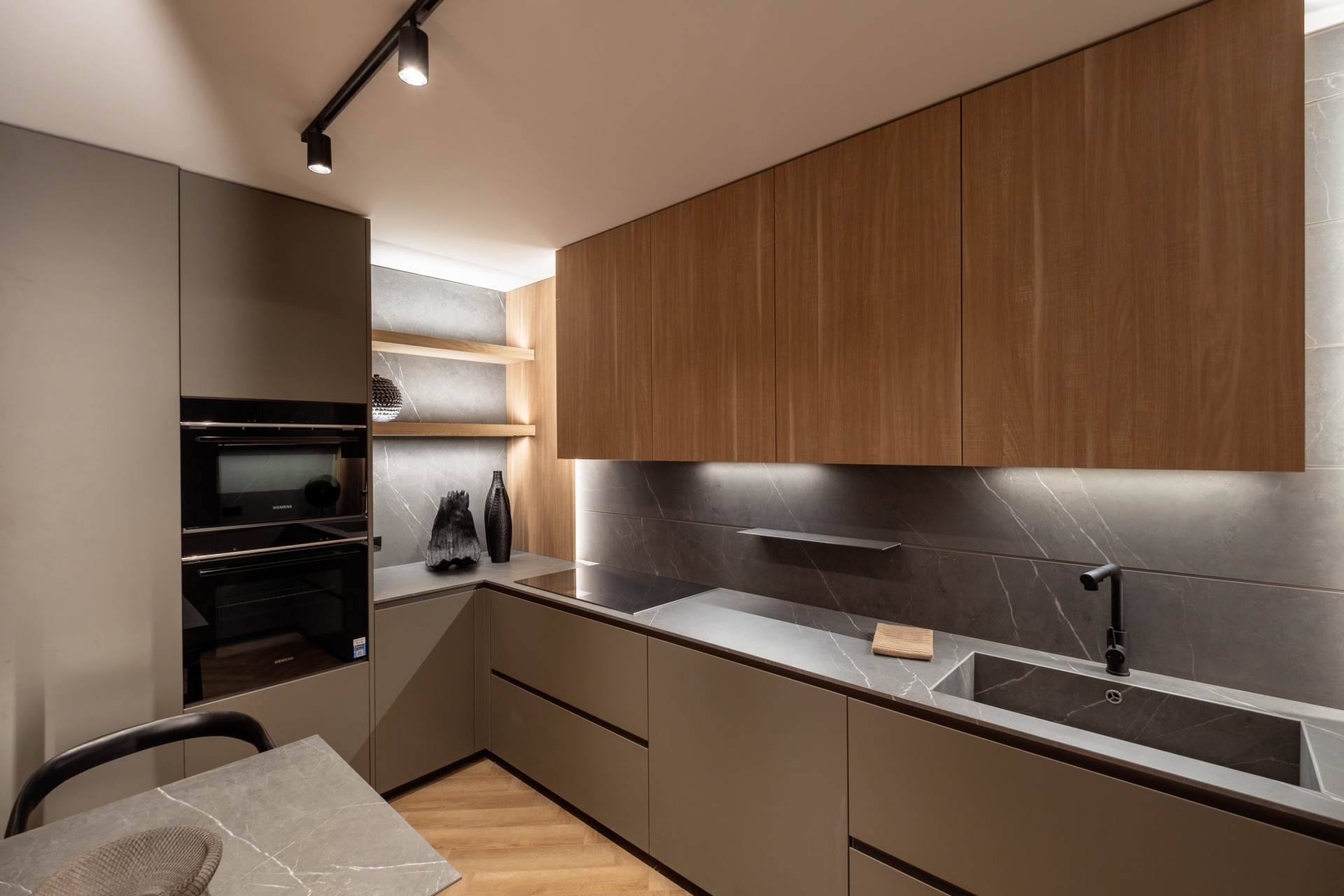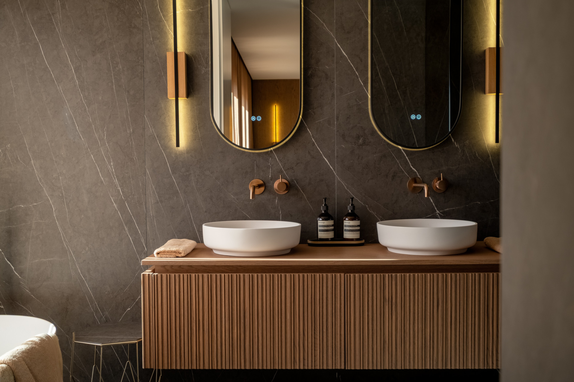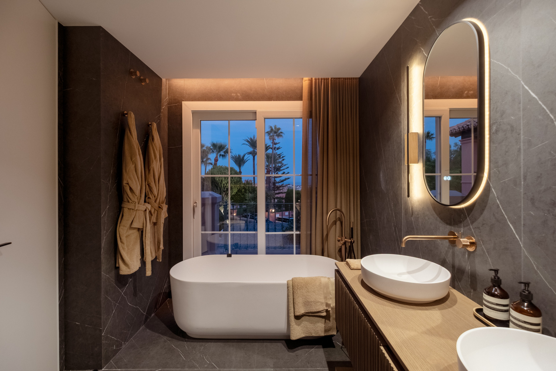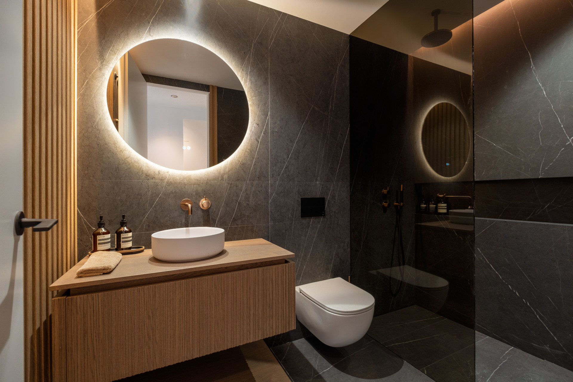 The property features three spacious bedrooms, each with its own en-suite bathroom. The interior design blends abundant natural light with a rich palette of dark wood and grey stone, crafting an atmosphere of elegance and comfort. Floor-to-ceiling sliding doors open fully to the terrace, enhancing the connection between indoor and outdoor living.