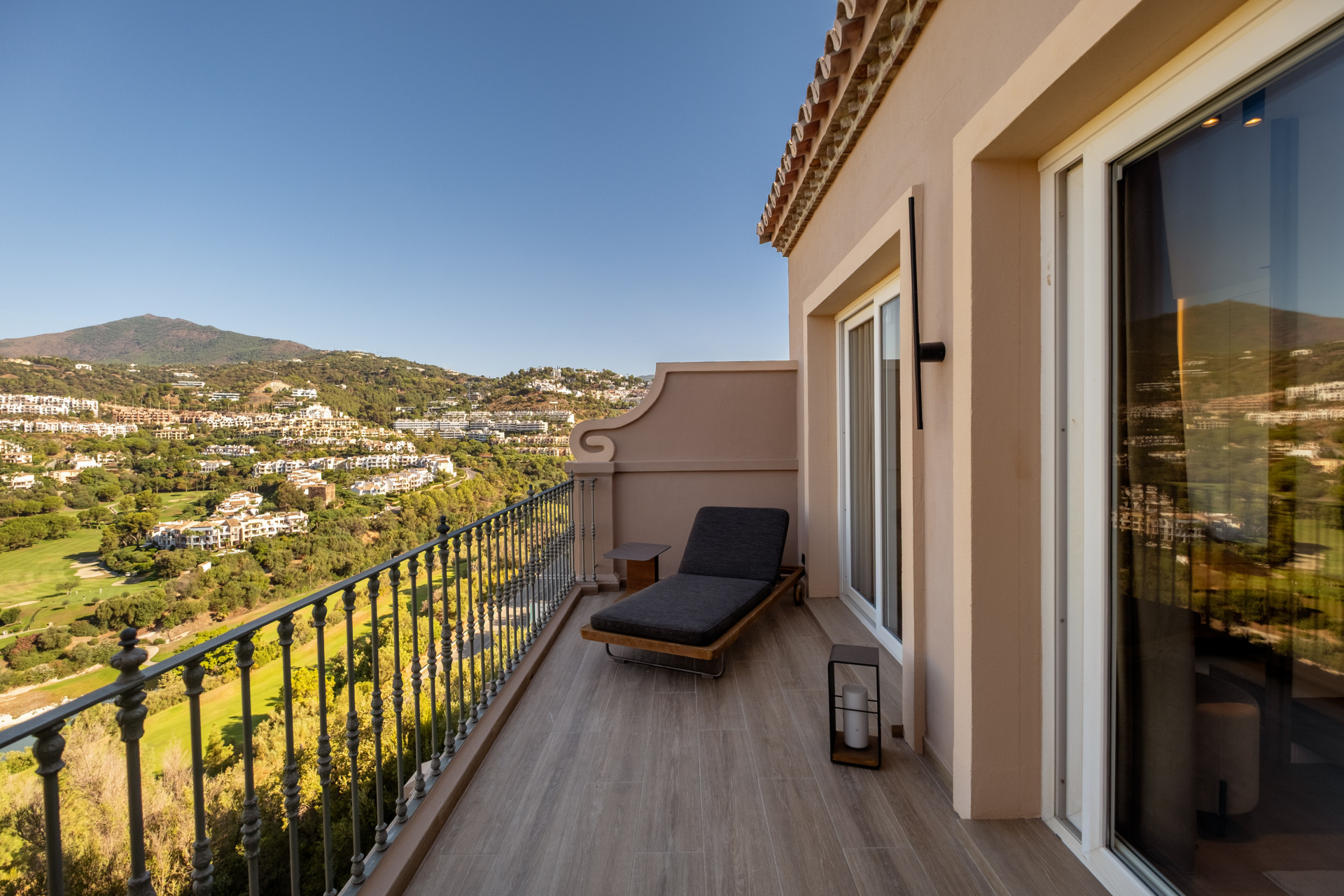 Discover a rare opportunity to enjoy refined hillside living in one of Benahavís’ most desirable residential communities. Set within a secure and peaceful development, this beautifully renovated townhouse spans two floors and offers approximately 160 m² of interior living space, complemented by a generous west-facing terrace with sweeping panoramic views over nearby golf courses and the Sierra de las Nieves mountain range.