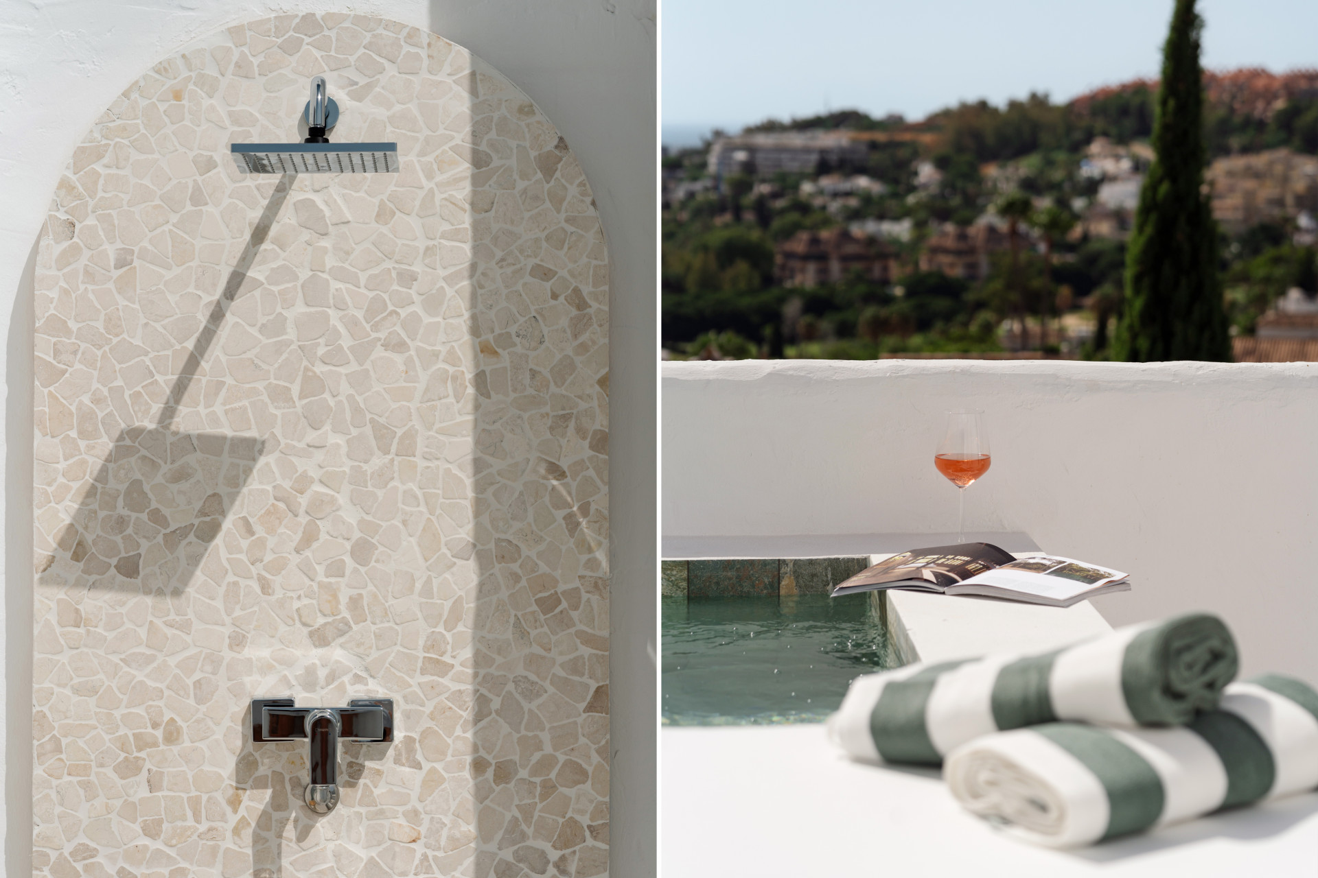 En trappa upp finns ytterligare två sovrum med egna badrum och terrasser. Mastersviten har en walk-in-garderob och en rymlig terrass med privat plaskpool, utedusch och obruten havsutsikt – en sann tillflyktsort.