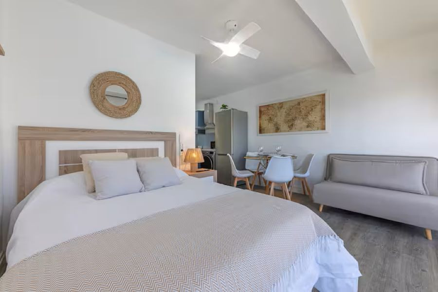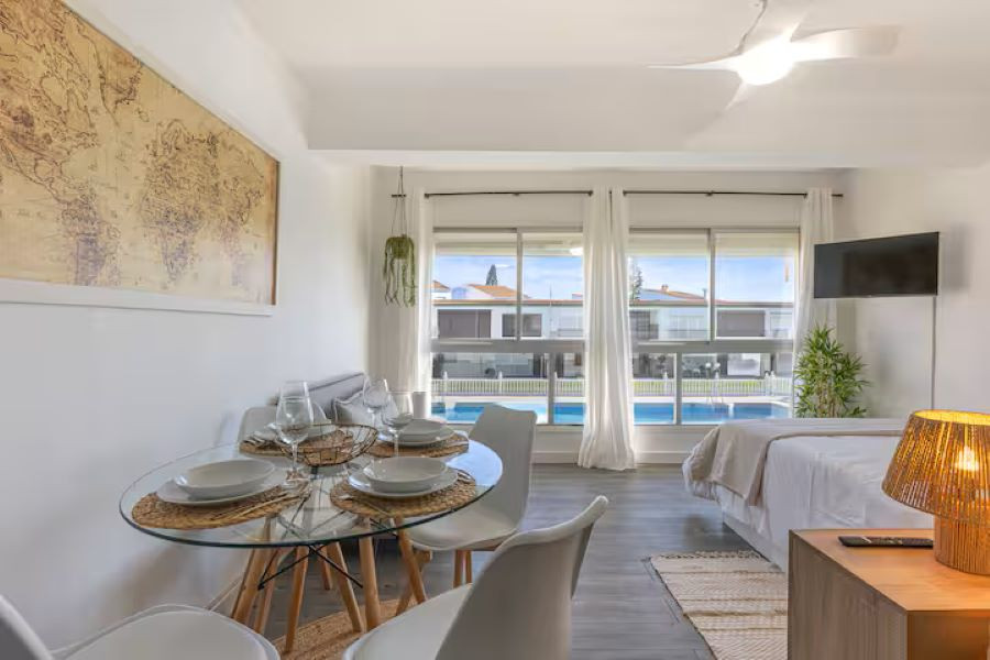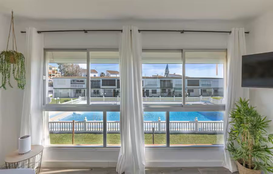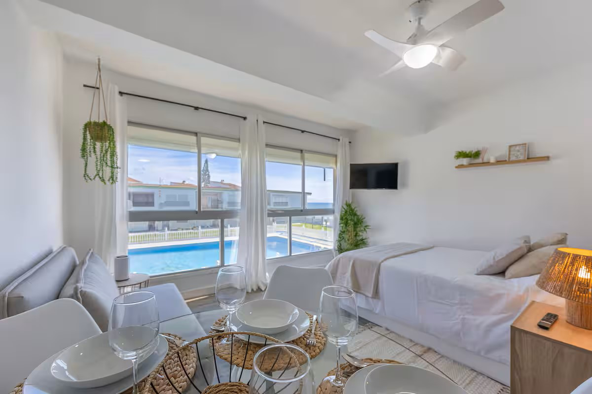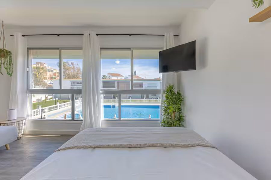 40 kvm studiolägenhet, nyrenoverad med dubbelsäng och bäddsoffa, kök med mikrovågsugn, spis, stort kylskåp, fläkt och tvättmaskin. Helt renoverat badrum med dusch. Ingen terrass, men stora fönster mot poolen med havsutsikt. Carport inne i det bevakade området. Utmärkt för ett par eller en person. Inga husdjur!